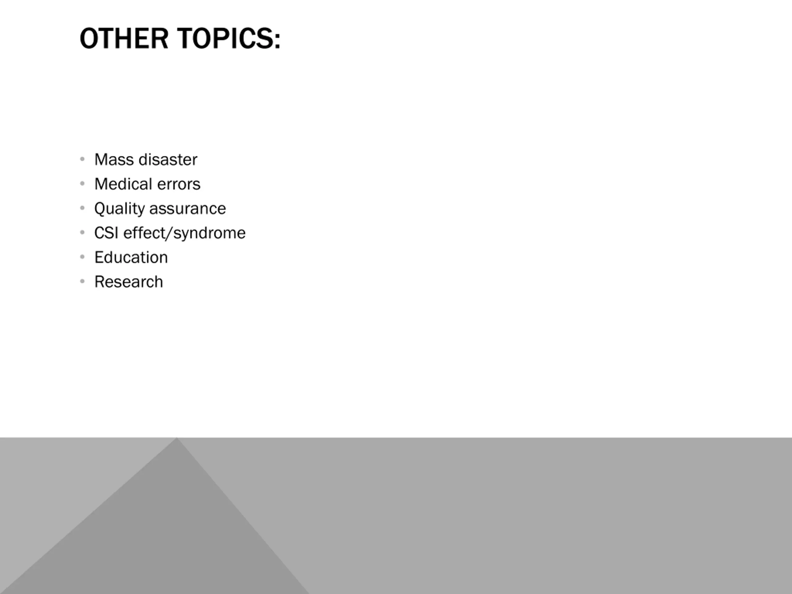 OTHER TOPICS: Mass disaster Medical errors Quality assurance CSI effect/syndrome Education Research