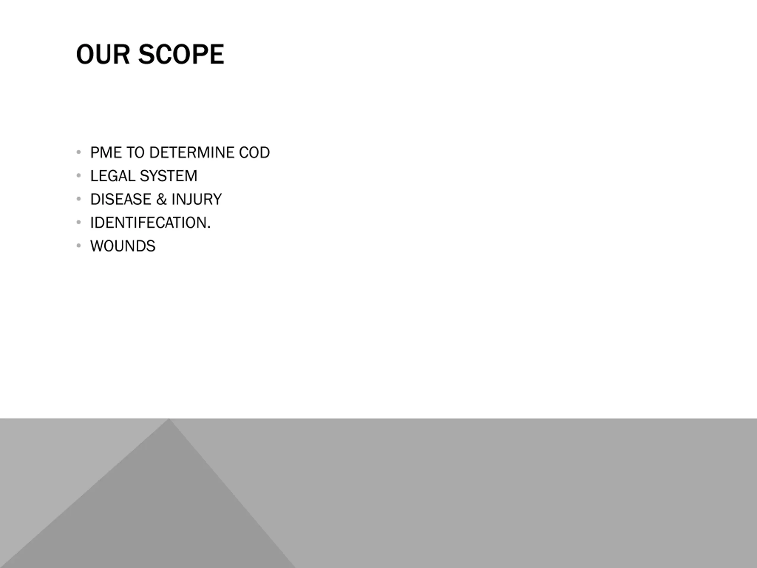 OUR SCOPE PME TO DETERMINE COD LEGAL SYSTEM DISEASE & INJURY IDENTIFECATION. WOUNDS