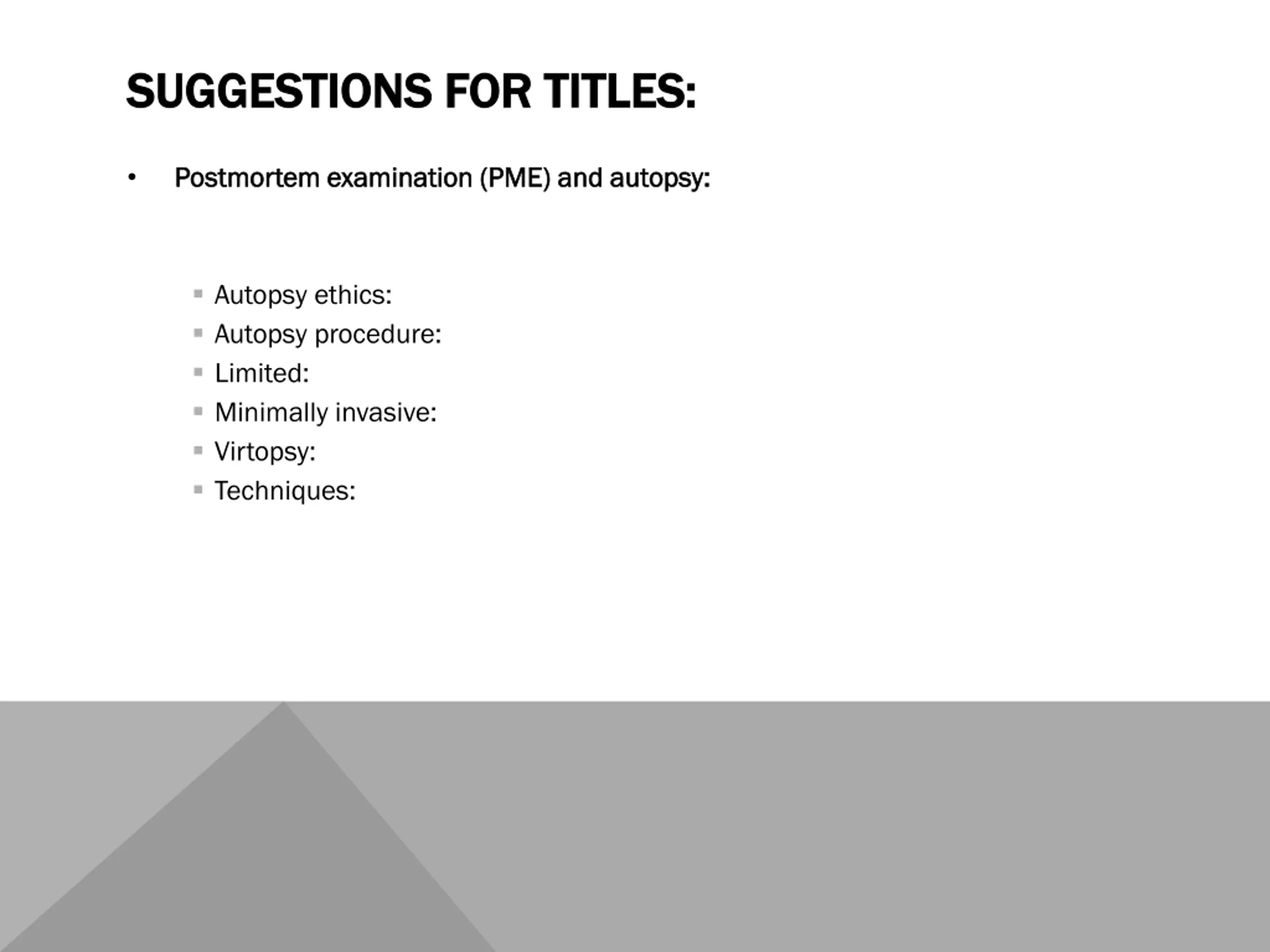 SUGGESTIONS FOR TITLES: SUGGESTIONS FOR TITLES: Postmortem examination (PME) and autopsy: Postmortem examination (PME) and autopsy: Autopsy ethics: Autopsy procedure: Limited: Minimally invasive: Virtopsy: Techniques: