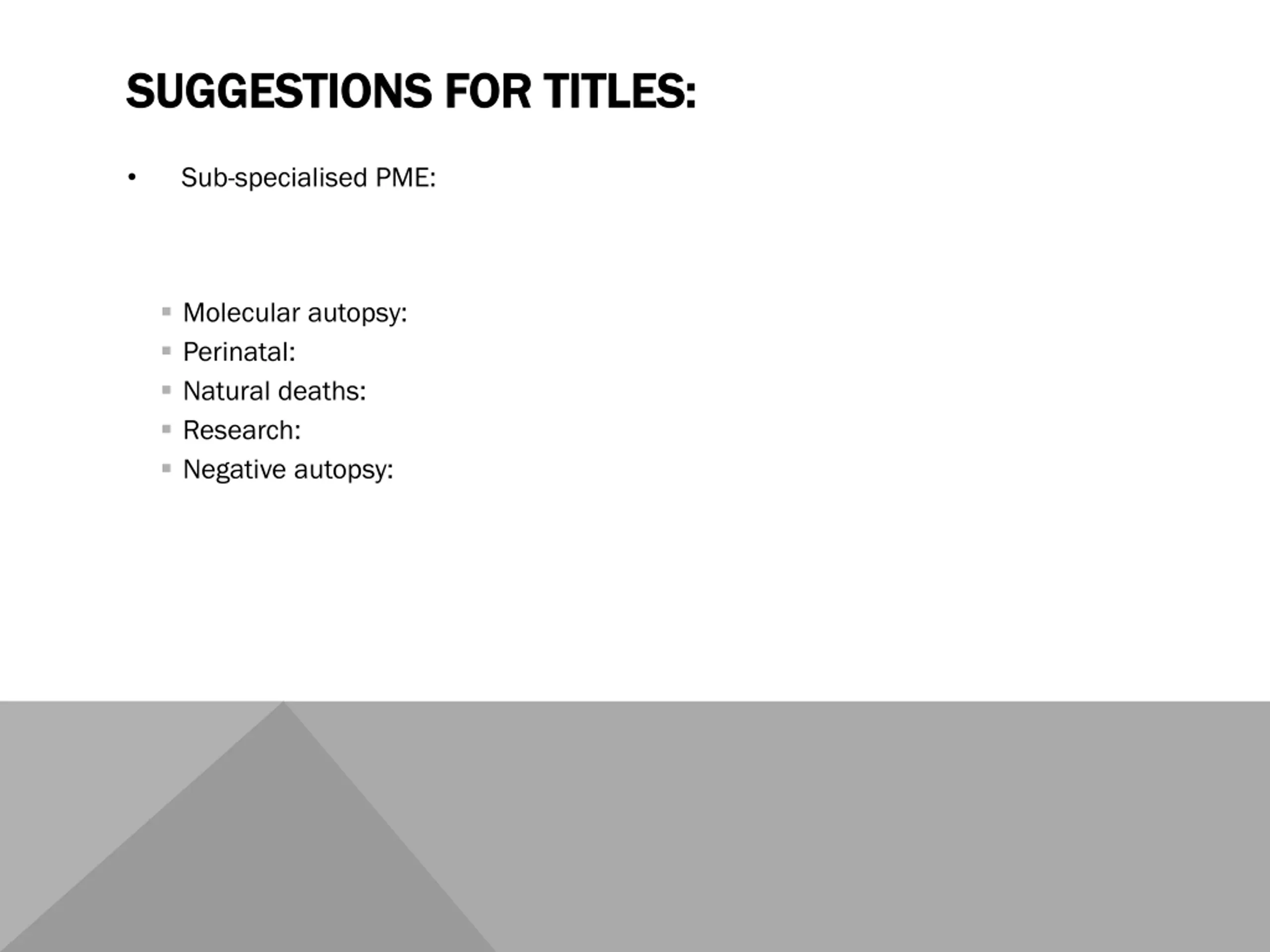 SUGGESTIONS FOR TITLES: SUGGESTIONS FOR TITLES: Sub-specialised PME: Molecular autopsy: Perinatal: Natural deaths: Research: Negative autopsy: