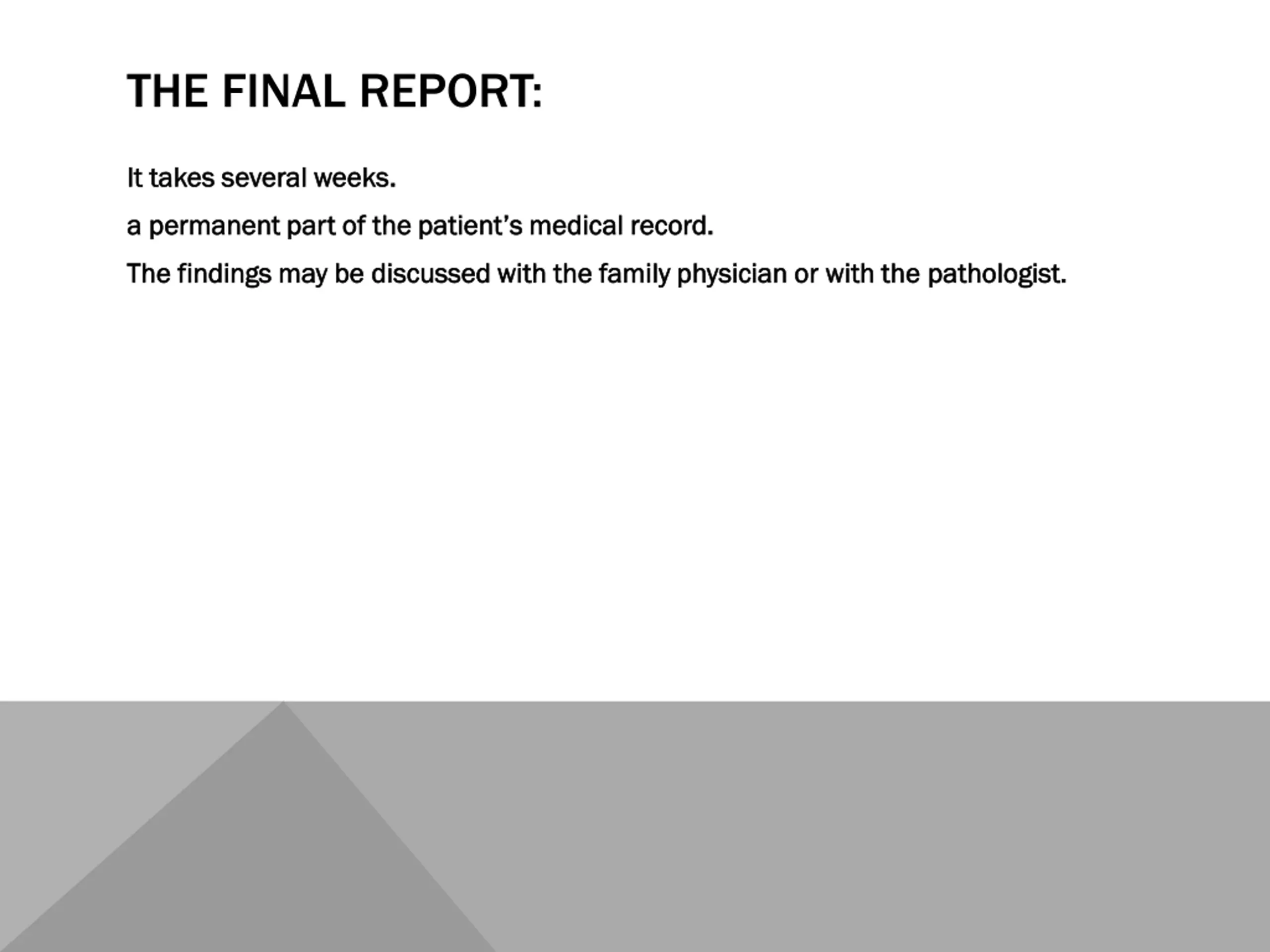 THE FINAL REPORT: It takes It takes several several weeks. weeks. a a permanent part of the patient permanent part of the patient s medical s medical record. record. The findings may be discussed with the family physician or with the The findings may be discussed with the family physician or with the pathologist. pathologist.