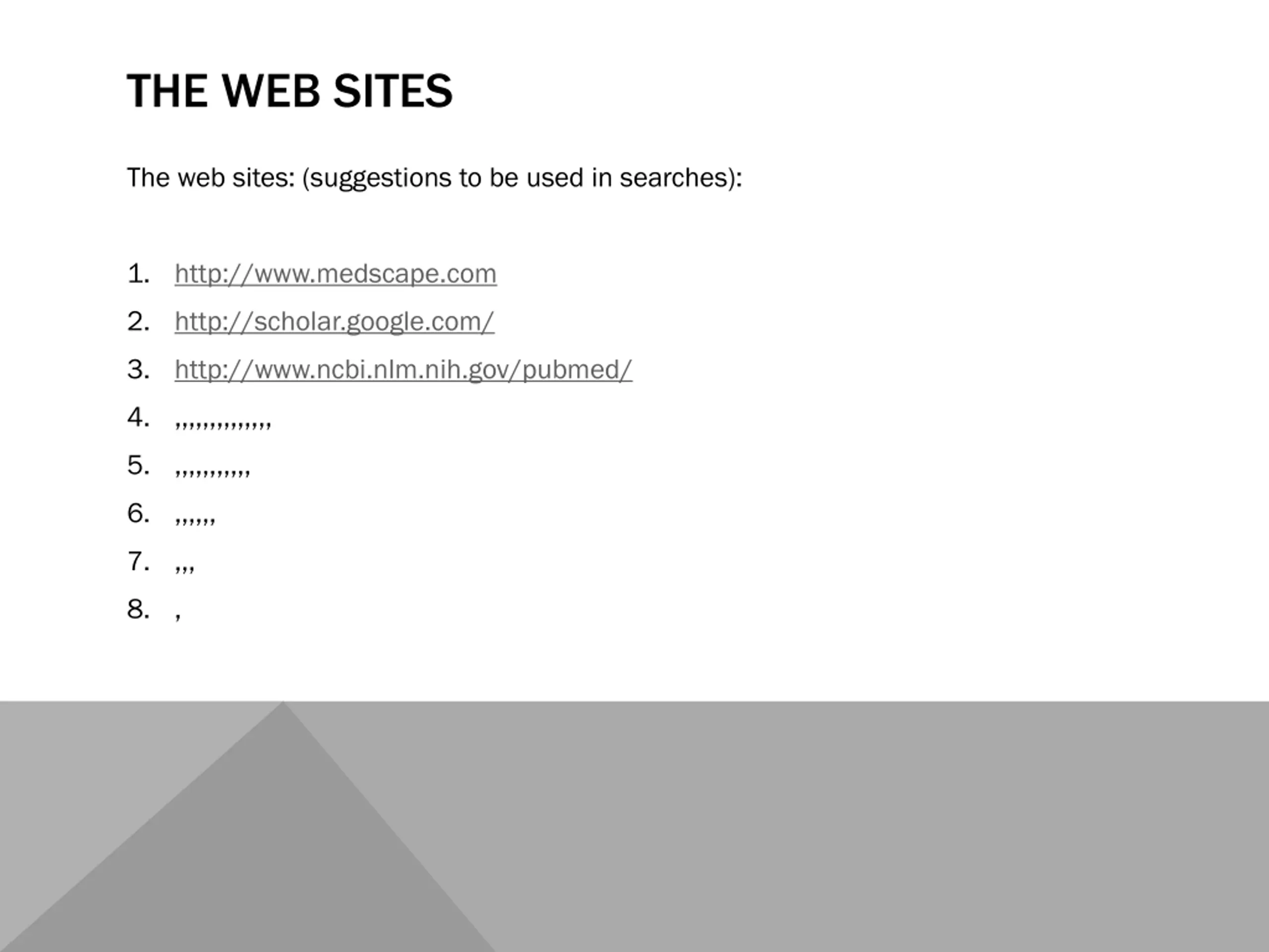 THE WEB SITES The web sites: (suggestions to be used in searches): 1. http://www.medscape.com 2. http://scholar.google.com/ 3. http://www.ncbi.nlm.nih.gov/pubmed/ 4. ,,,,,,,,,,,,,, 5. ,,,,,,,,,,, 6. ,,,,,, 7. ,,, 8. ,