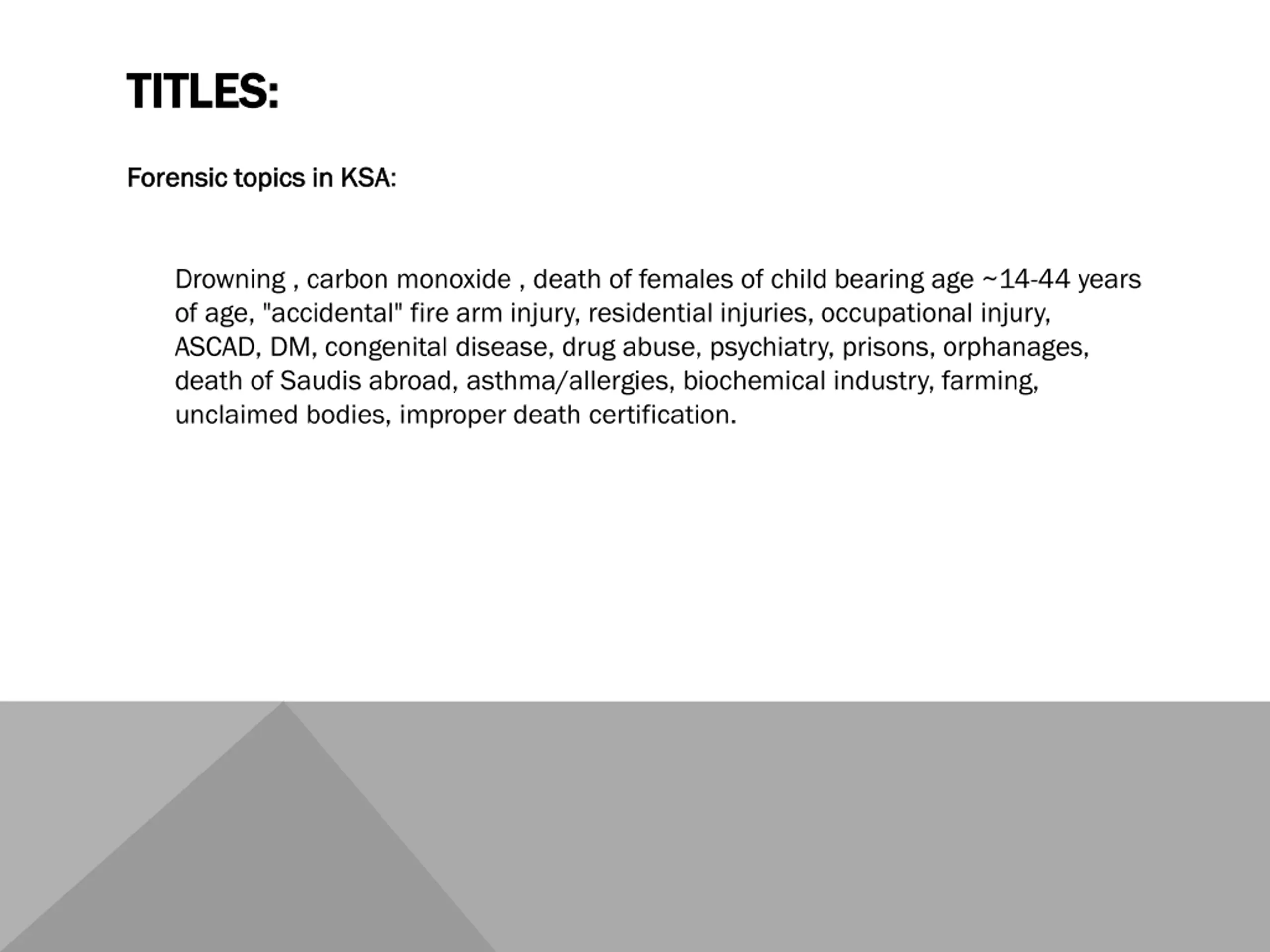 TITLES: TITLES: Forensic topics in KSA Forensic topics in KSA: Drowning , carbon monoxide , death of females of child bearing age ~14-44 years of age, "accidental" fire arm injury, residential injuries, occupational injury, ASCAD, DM, congenital disease, drug abuse, psychiatry, prisons, orphanages, death of Saudis abroad, asthma/allergies, biochemical industry, farming, unclaimed bodies, improper death certification.