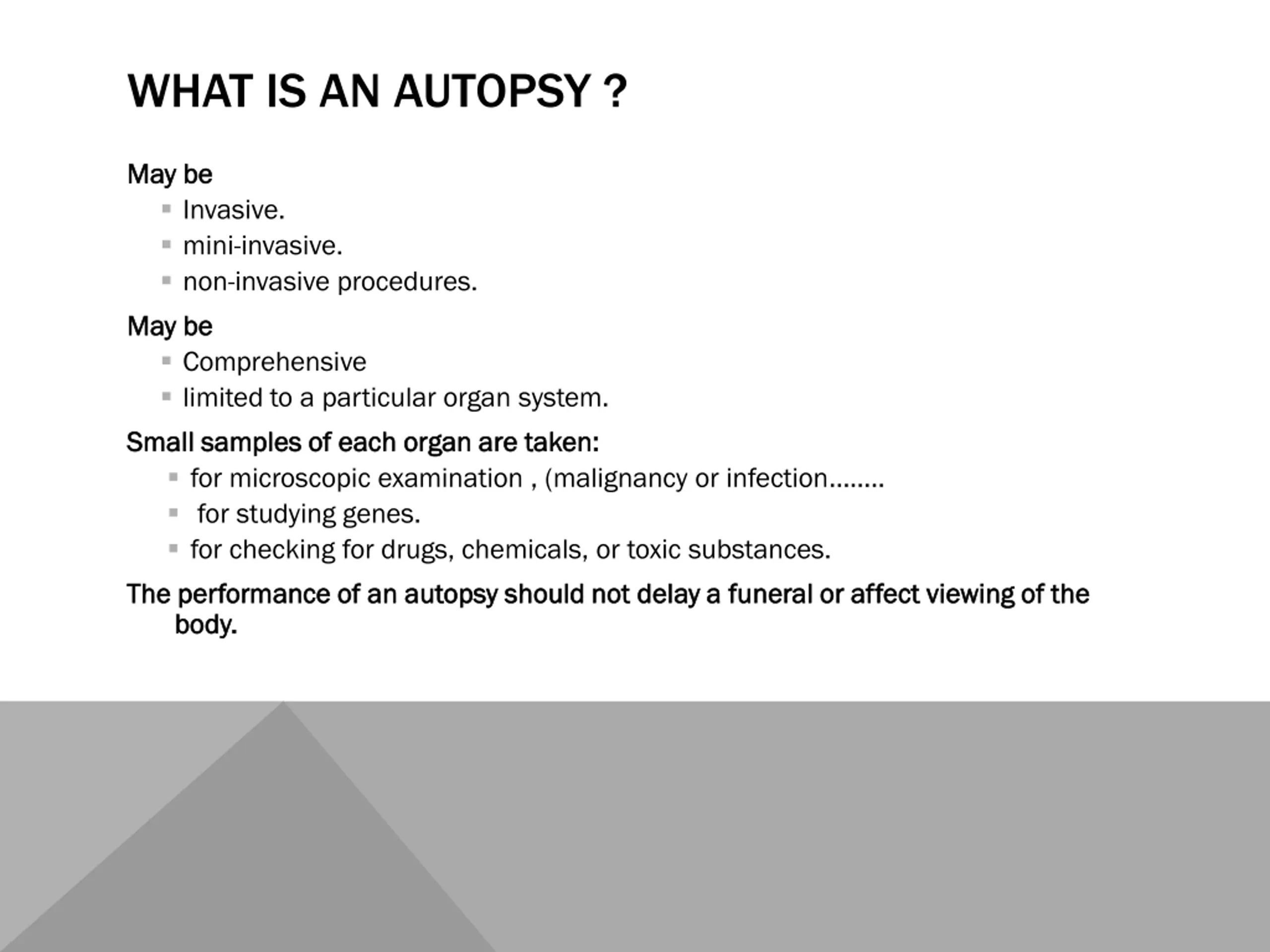 WHAT IS AN AUTOPSY ? May be May be Invasive. mini-invasive. non-invasive procedures. May be May be Comprehensive limited to a particular organ system. Small samples of each organ are taken: Small samples of each organ are taken: for microscopic examination , (malignancy or infection .. for studying genes. for checking for drugs, chemicals, or toxic substances. The performance of an autopsy should not delay a funeral or affect viewing of the The performance of an autopsy should not delay a funeral or affect viewing of the body. body.
