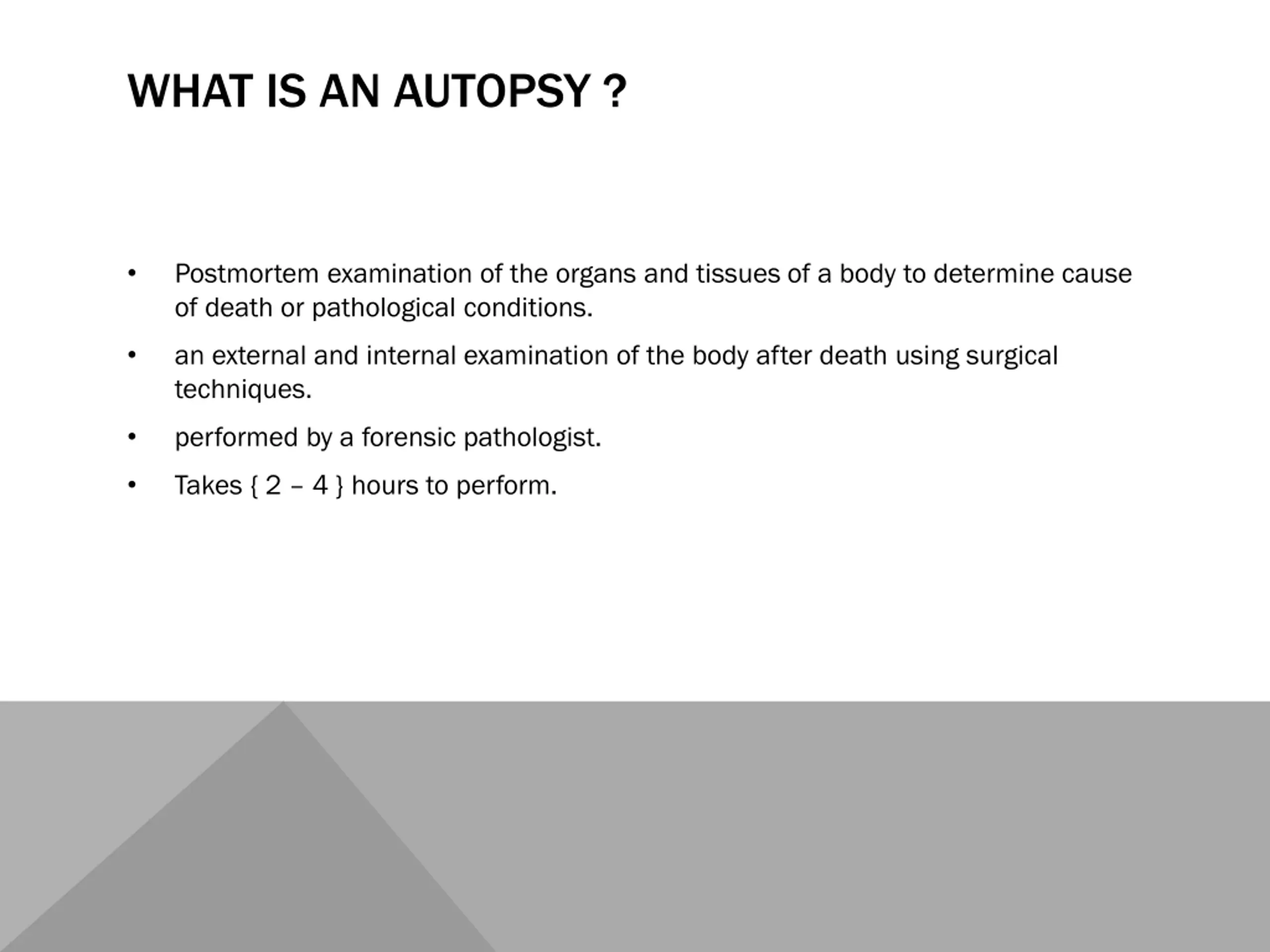 WHAT IS AN AUTOPSY ? Postmortem examination of the organs and tissues of a body to determine cause of death or pathological conditions. an external and internal examination of the body after death using surgical techniques. performed by a forensic pathologist. Takes { 2 4 } hours to perform.