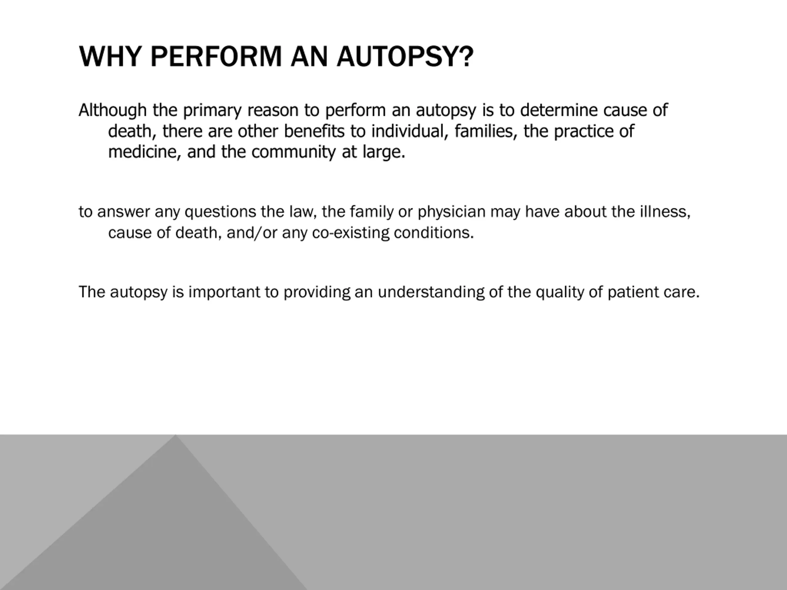 WHY PERFORM AN AUTOPSY? Although the primary reason to perform an autopsy is to determine cause of death, there are other benefits to individual, families, the practice of medicine, and the community at large. to answer any questions the law, the family or physician may have about the illness, cause of death, and/or any co-existing conditions. The autopsy is important to providing an understanding of the quality of patient care.