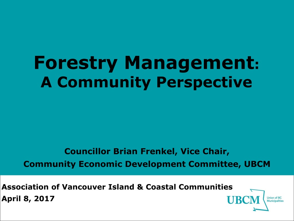 Forestry Management: A Community Perspective Councillor Brian Frenkel, Vice Chair, Community Economic Development Committee, UBCM Association of Vancouver Island & Coastal Communities April 8, 2017