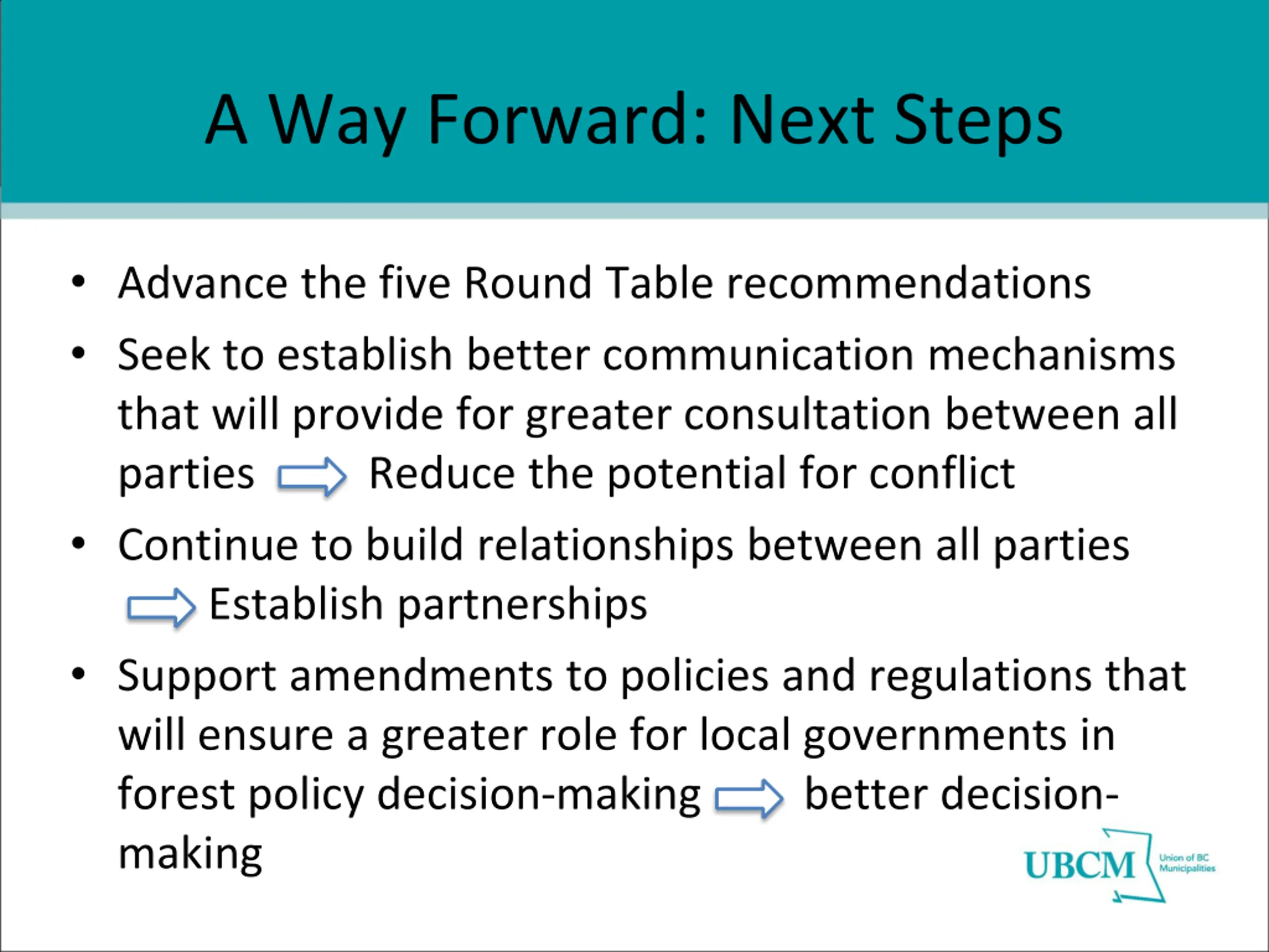 A Way Forward: Next Steps Advance the five Round Table recommendations Seek to establish better communication mechanisms that will provide for greater consultation between all parties Reduce the potential for conflict Continue to build relationships between all parties Establish partnerships Support amendments to policies and regulations that will ensure a greater role for local governments in forest policy decision-making making better decision-