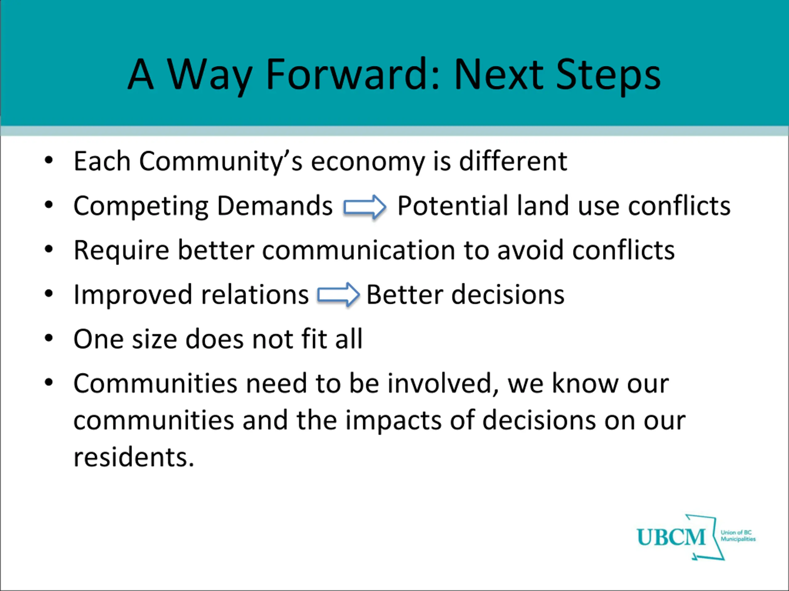 A Way Forward: Next Steps Each Community s economy is different Competing Demands Potential land use conflicts Require better communication to avoid conflicts Improved relations Better decisions One size does not fit all Communities need to be involved, we know our communities and the impacts of decisions on our residents.
