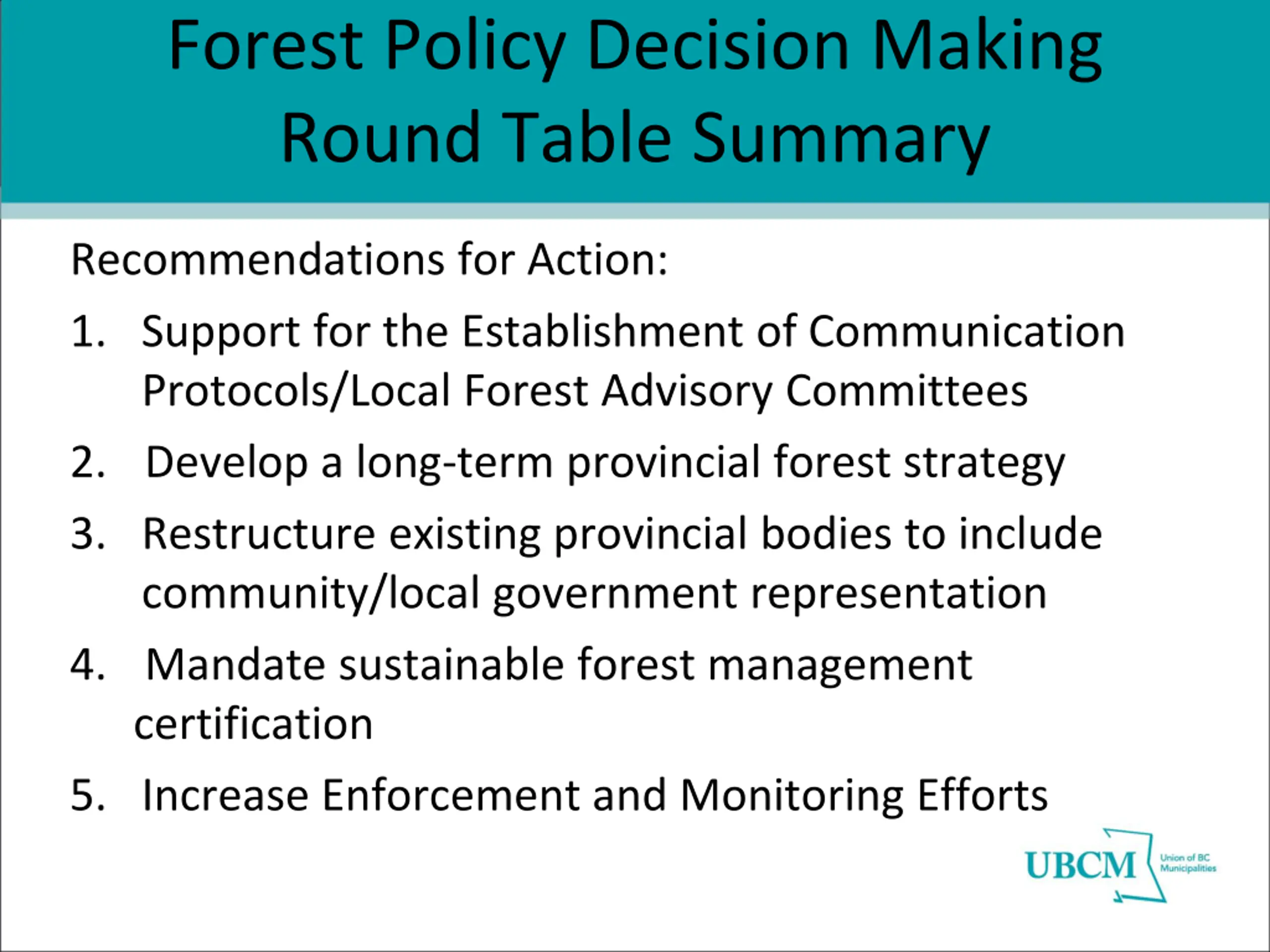 Forest Policy Decision Making Round Table Summary Recommendations for Action: 1. Support for the Establishment of Communication Protocols/Local Forest Advisory Committees 2. Develop a long-term provincial forest strategy 3. Restructure existing provincial bodies to include community/local government representation 4. Mandate sustainable forest management certification 5. Increase Enforcement and Monitoring Efforts
