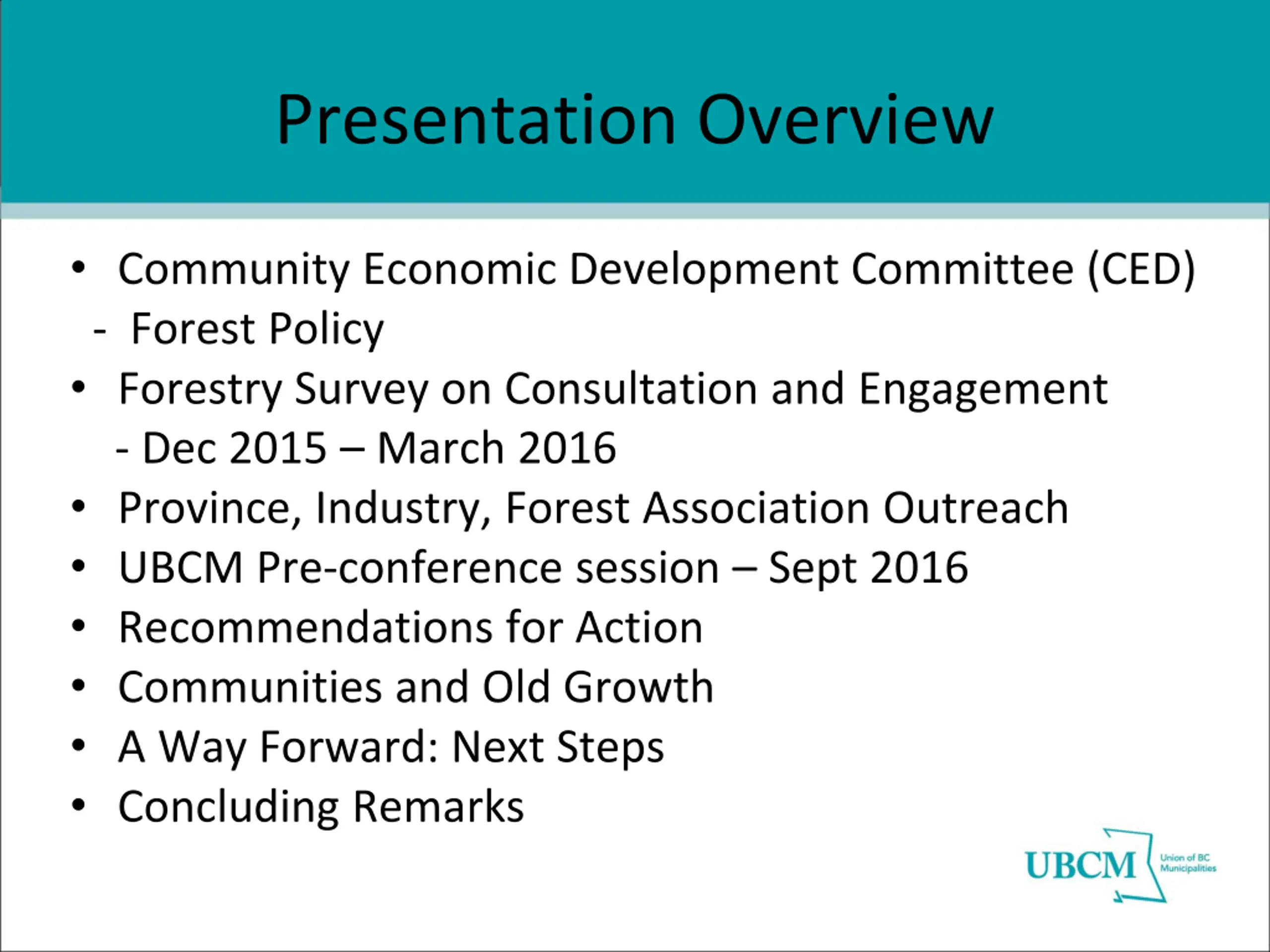 Presentation Overview Community Economic Development Committee (CED) - Forest Policy Forestry Survey on Consultation and Engagement - Dec 2015 March 2016 Province, Industry, Forest Association Outreach UBCM Pre-conference session Sept 2016 Recommendations for Action Communities and Old Growth A Way Forward: Next Steps Concluding Remarks