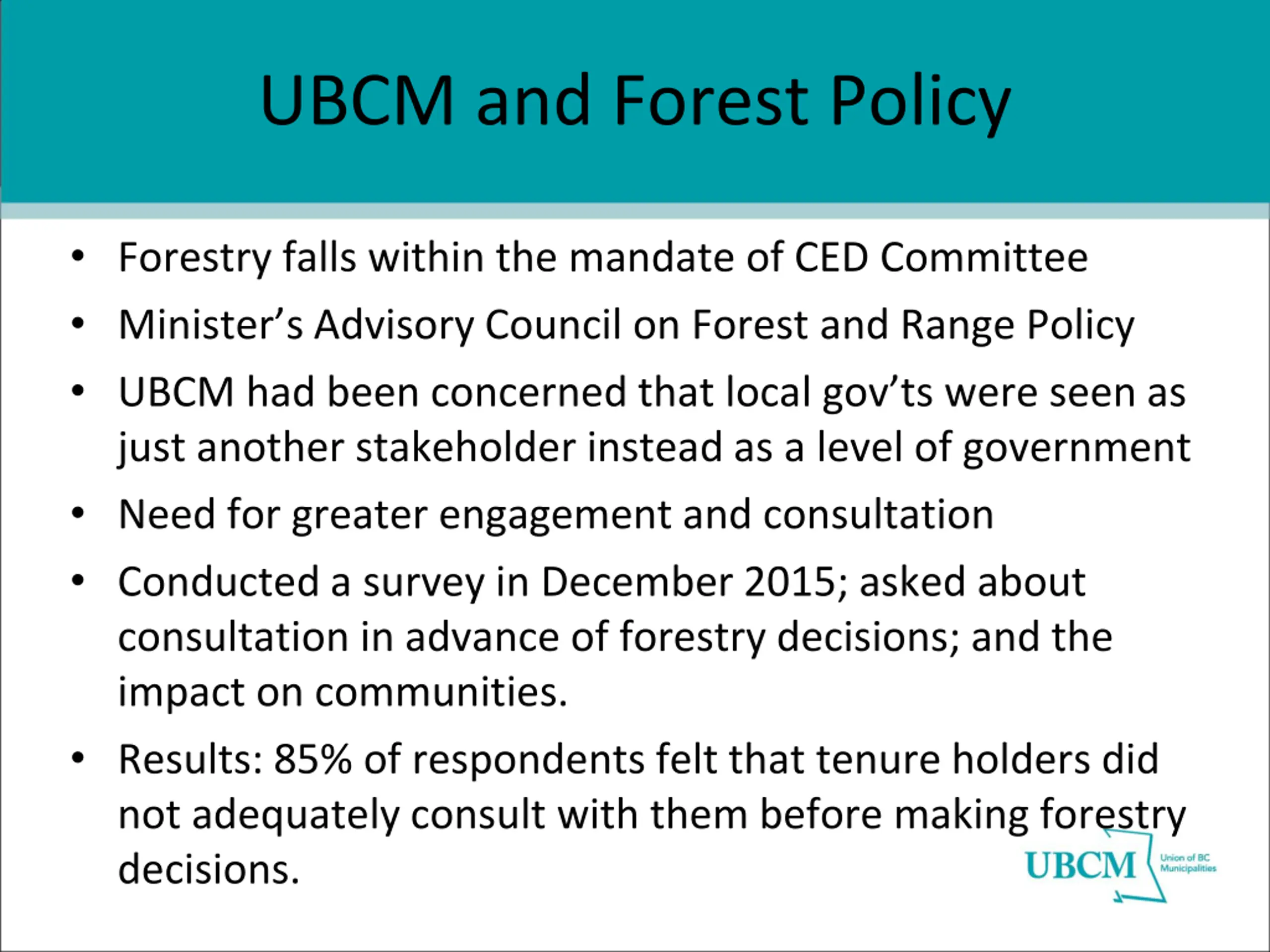 UBCM and Forest Policy Forestry falls within the mandate of CED Committee Minister s Advisory Council on Forest and Range Policy UBCM had been concerned that local gov ts were seen as just another stakeholder instead as a level of government Need for greater engagement and consultation Conducted a survey in December 2015; asked about consultation in advance of forestry decisions; and the impact on communities. Results: 85% of respondents felt that tenure holders did not adequately consult with them before making forestry decisions.