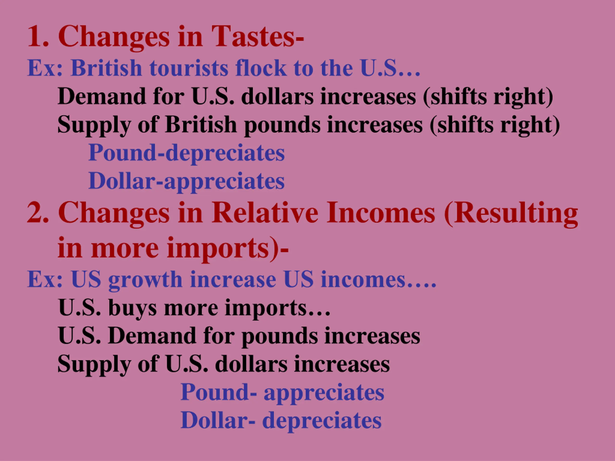 1. Changes in Tastes- Ex: British tourists flock to the U.S Demand for U.S. dollars increases (shifts right) Supply of British pounds increases (shifts right) Pound-depreciates Dollar-appreciates 2. Changes in Relative Incomes (Resulting in more imports)- Ex: US growth increase US incomes . U.S. buys more imports U.S. Demand for pounds increases Supply of U.S. dollars increases Pound- appreciates Dollar- depreciates