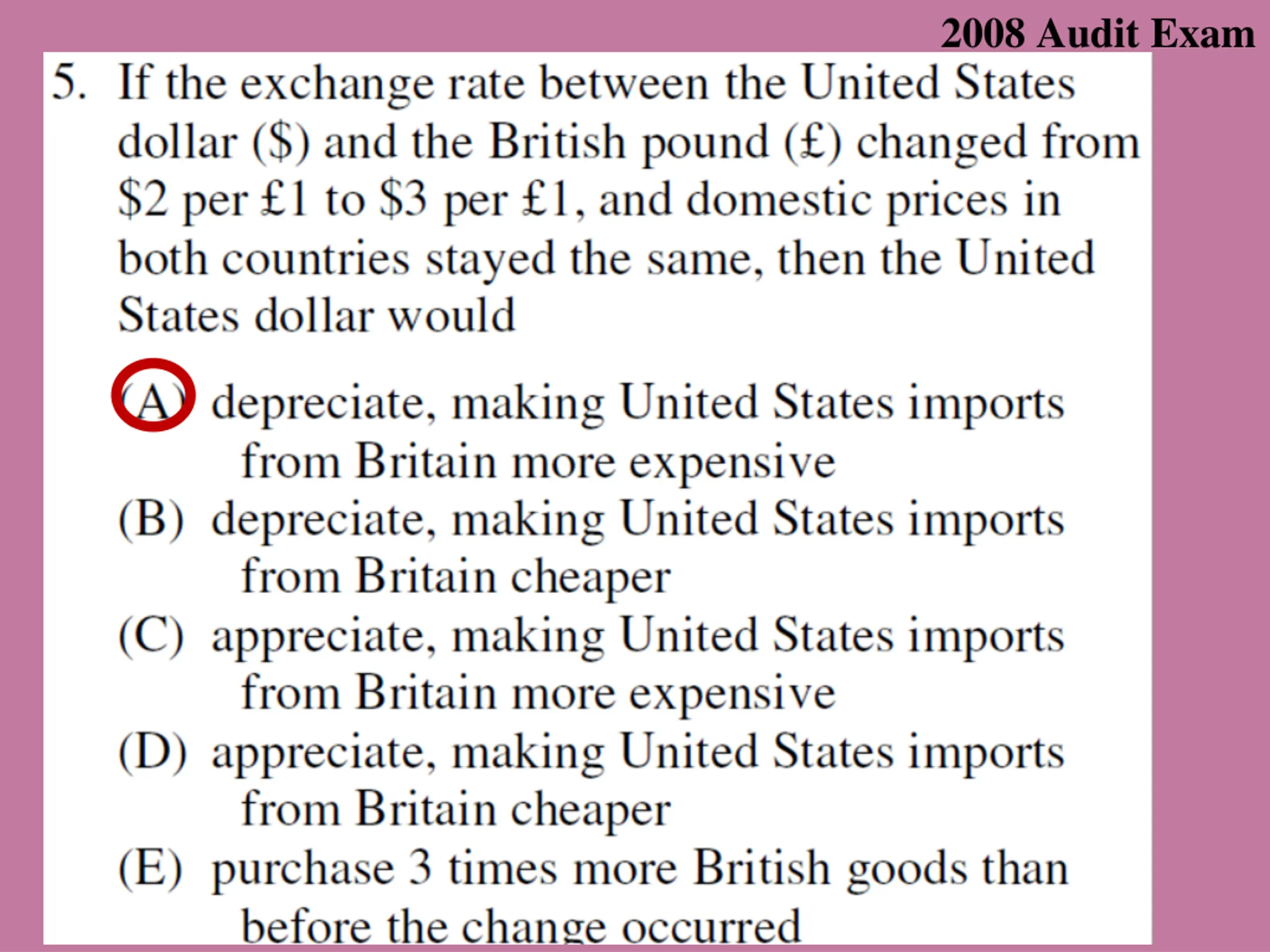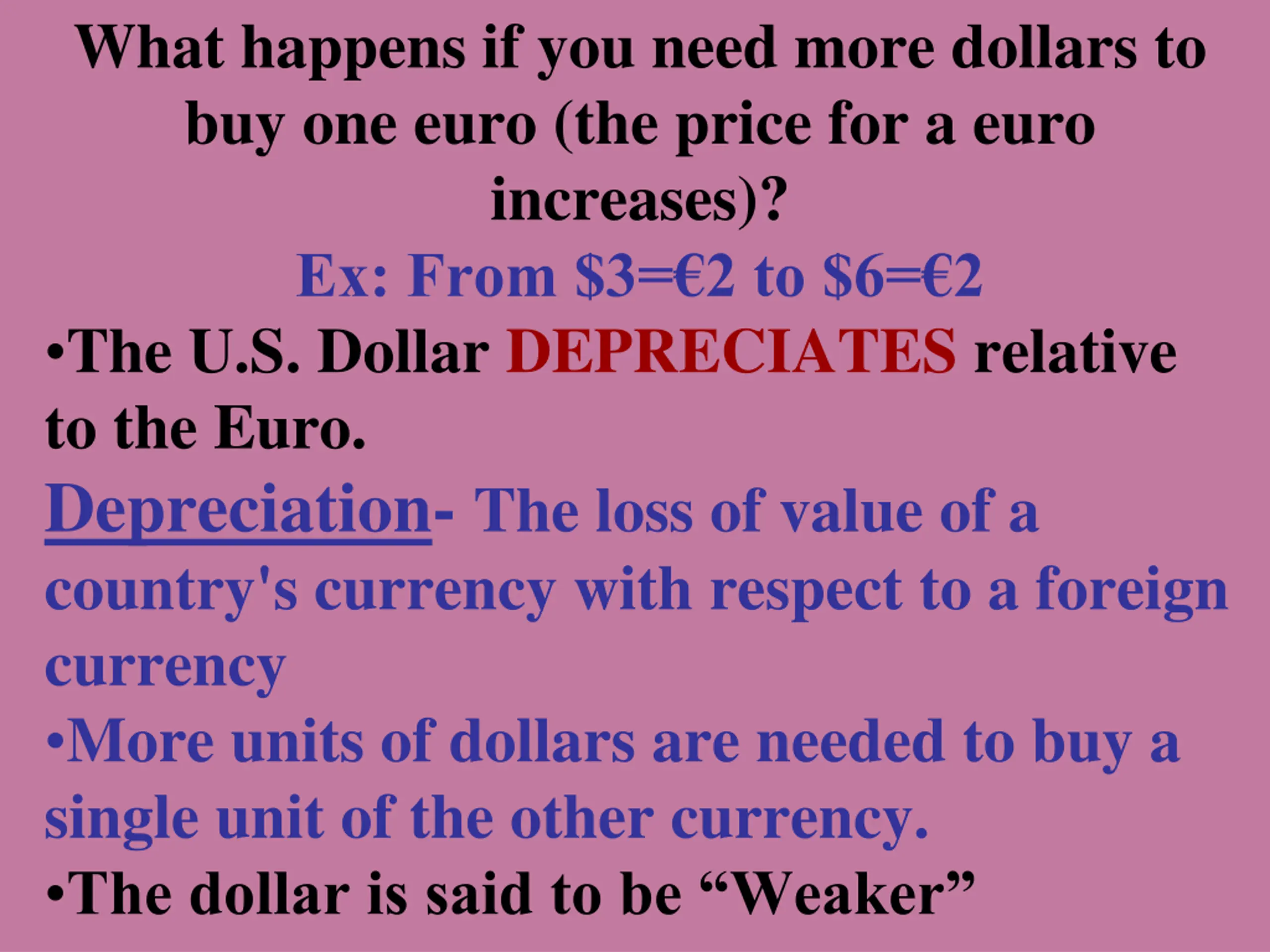 What happens if you need more dollars to buy one euro (the price for a euro increases)? Ex: From $3= 2 to $6= 2 The U.S. Dollar DEPRECIATES relative to the Euro. Depreciation- The loss of value of a country's currency with respect to a foreign currency More units of dollars are needed to buy a single unit of the other currency. The dollar is said to be Weaker