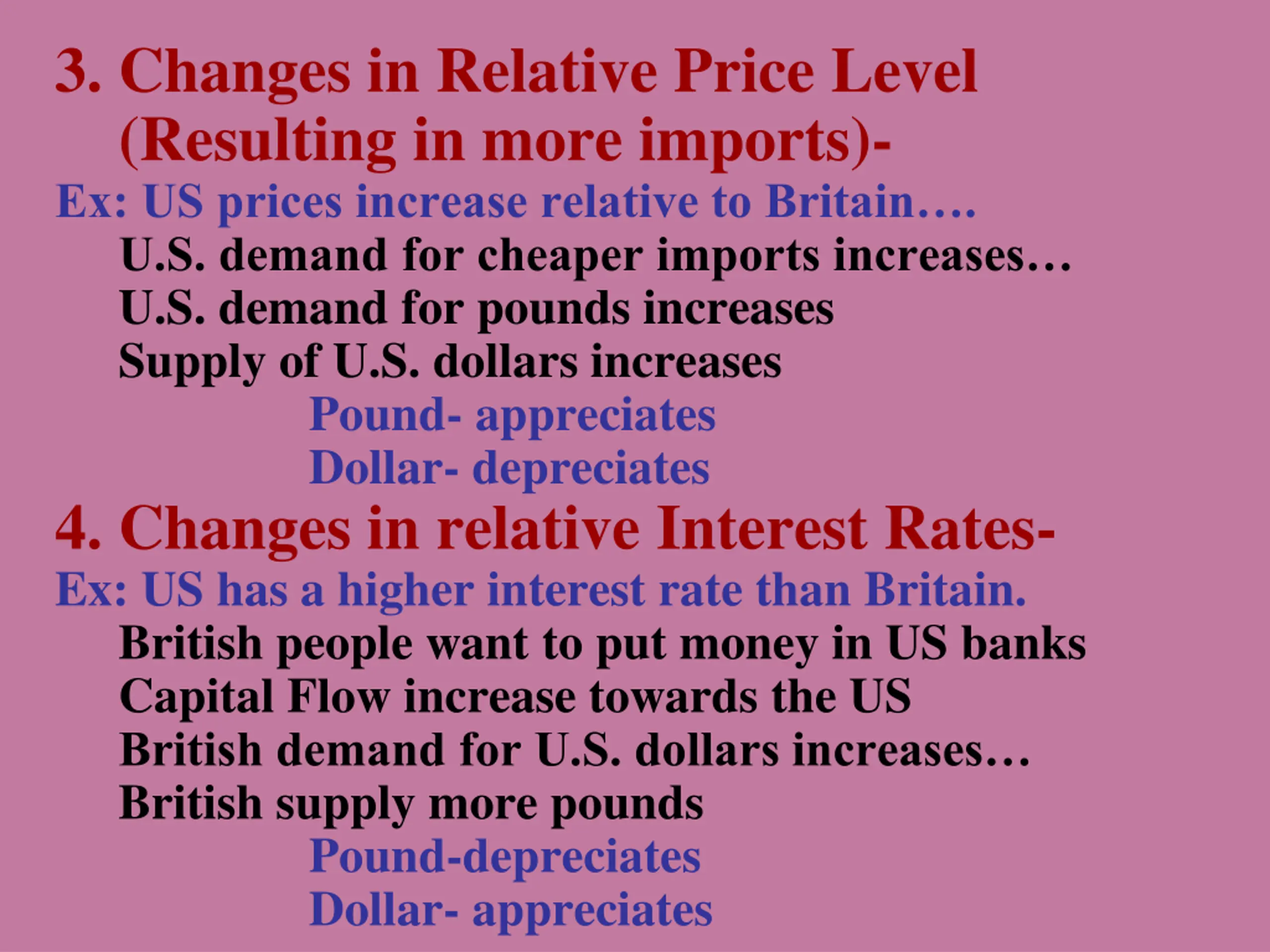 3. Changes in Relative Price Level (Resulting in more imports)- Ex: US prices increase relative to Britain . U.S. demand for cheaper imports increases U.S. demand for pounds increases Supply of U.S. dollars increases Pound- appreciates Dollar- depreciates 4. Changes in relative Interest Rates- Ex: US has a higher interest rate than Britain. British people want to put money in US banks Capital Flow increase towards the US British demand for U.S. dollars increases British supply more pounds Pound-depreciates Dollar- appreciates
