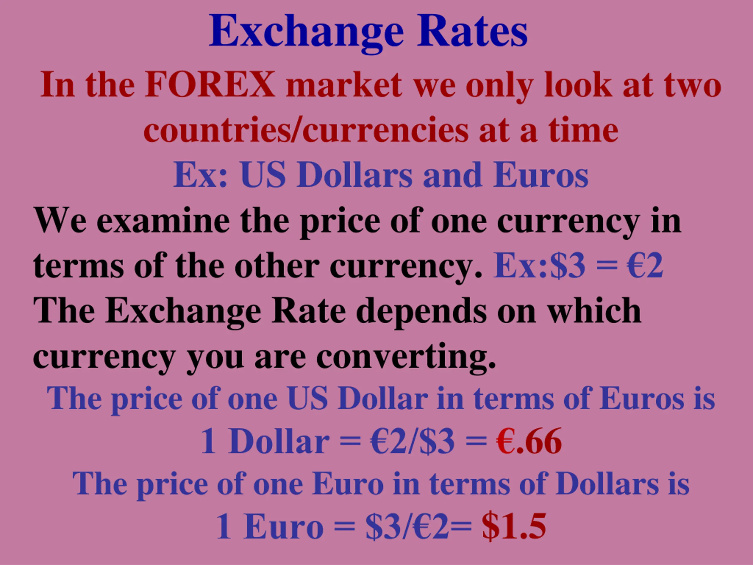 Exchange Rates In the FOREX market we only look at two countries/currencies at a time Ex: US Dollars and Euros We examine the price of one currency in terms of the other currency. Ex:$3 = 2 The Exchange Rate depends on which currency you are converting. The price of one US Dollar in terms of Euros is 1 Dollar = 2/$3 = .66 The price of one Euro in terms of Dollars is 1 Euro = $3/ 2= $1.5