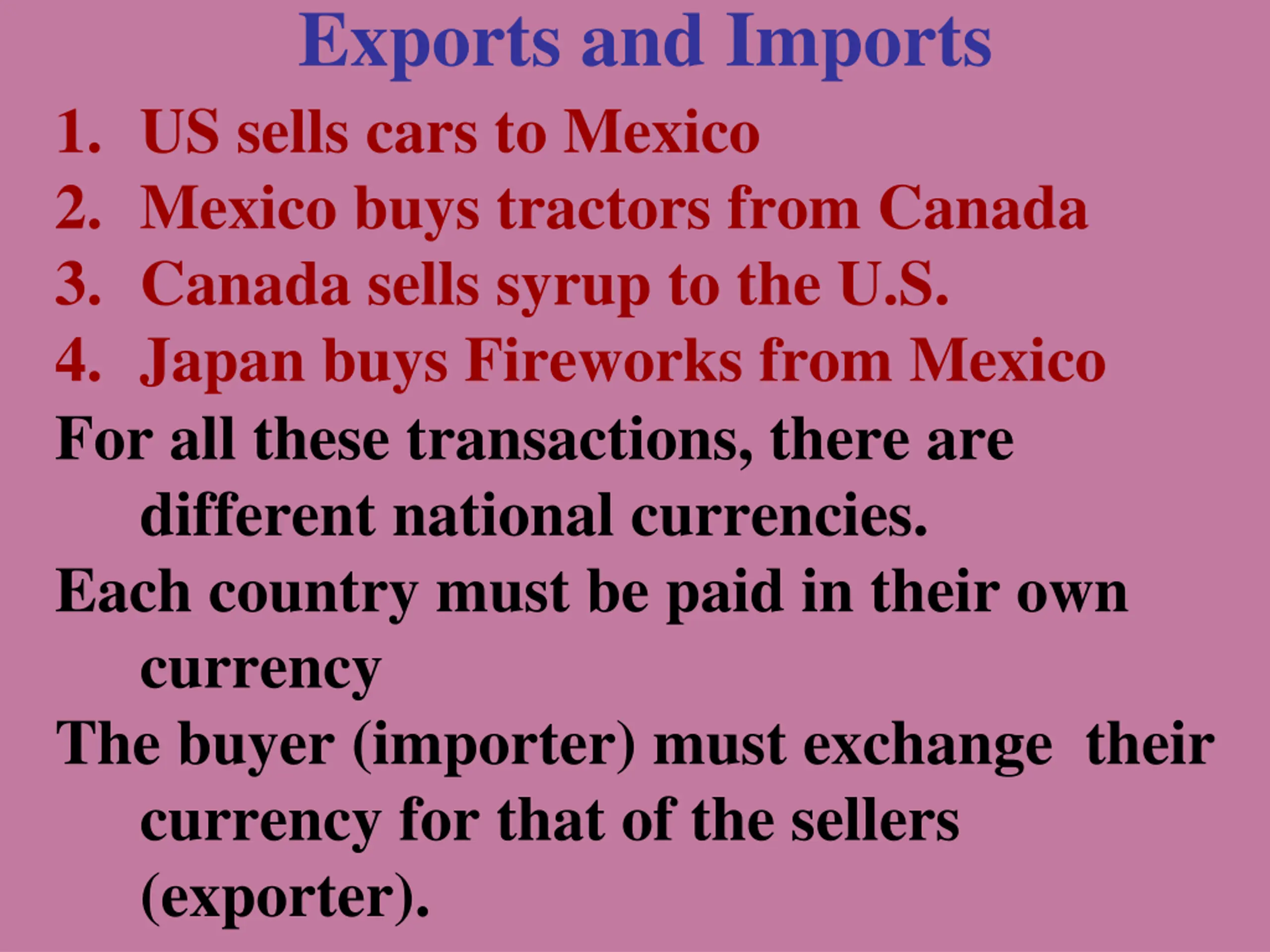 Exports and Imports 1. US sells cars to Mexico 2. Mexico buys tractors from Canada 3. Canada sells syrup to the U.S. 4. Japan buys Fireworks from Mexico For all these transactions, there are different national currencies. Each country must be paid in their own currency The buyer (importer) must exchange their currency for that of the sellers (exporter).