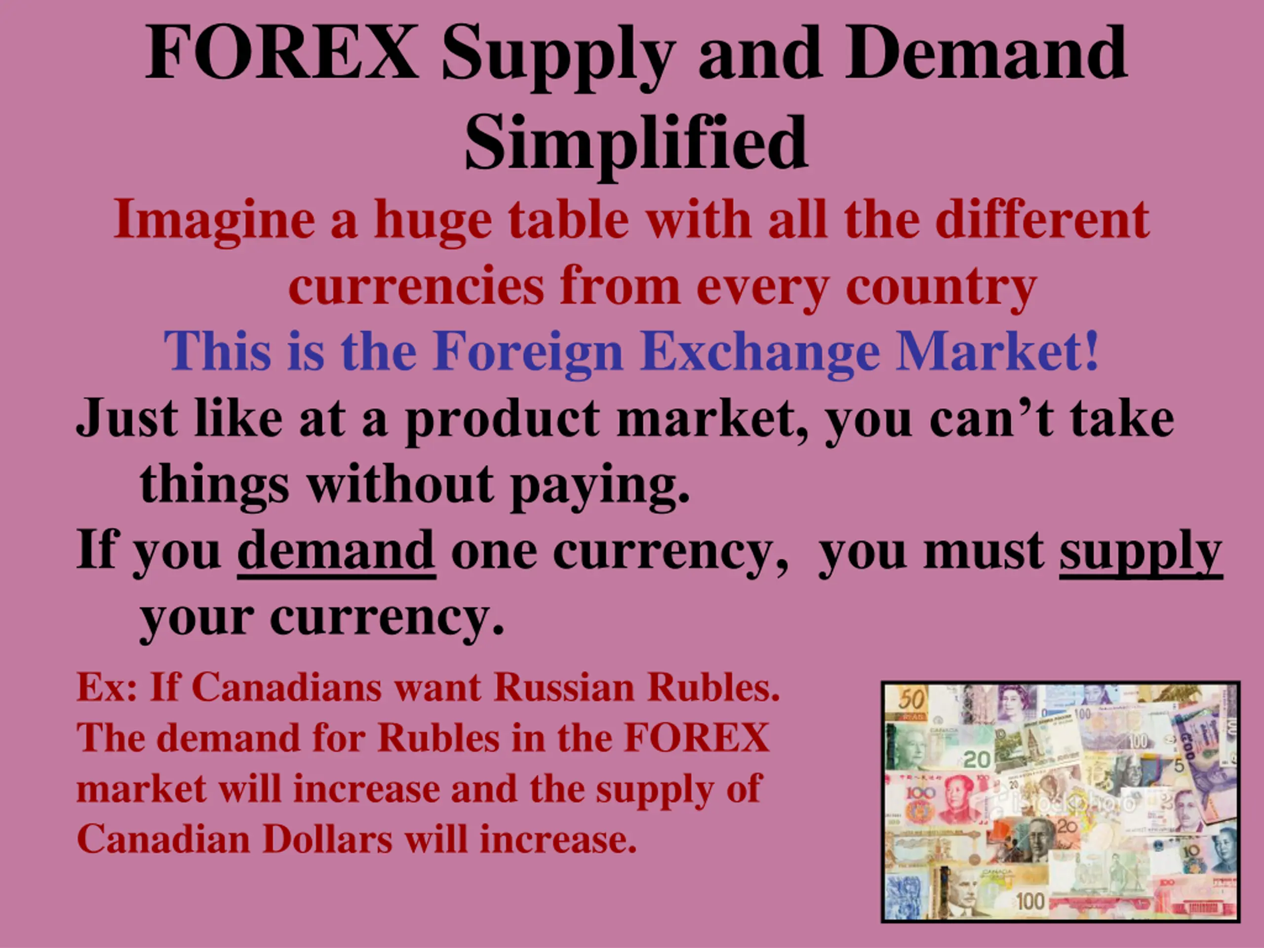 FOREX Supply and Demand Simplified Imagine a huge table with all the different currencies from every country This is the Foreign Exchange Market! Just like at a product market, you can t take things without paying. If you demand one currency, you must supply your currency. Ex: If Canadians want Russian Rubles. The demand for Rubles in the FOREX market will increase and the supply of Canadian Dollars will increase.