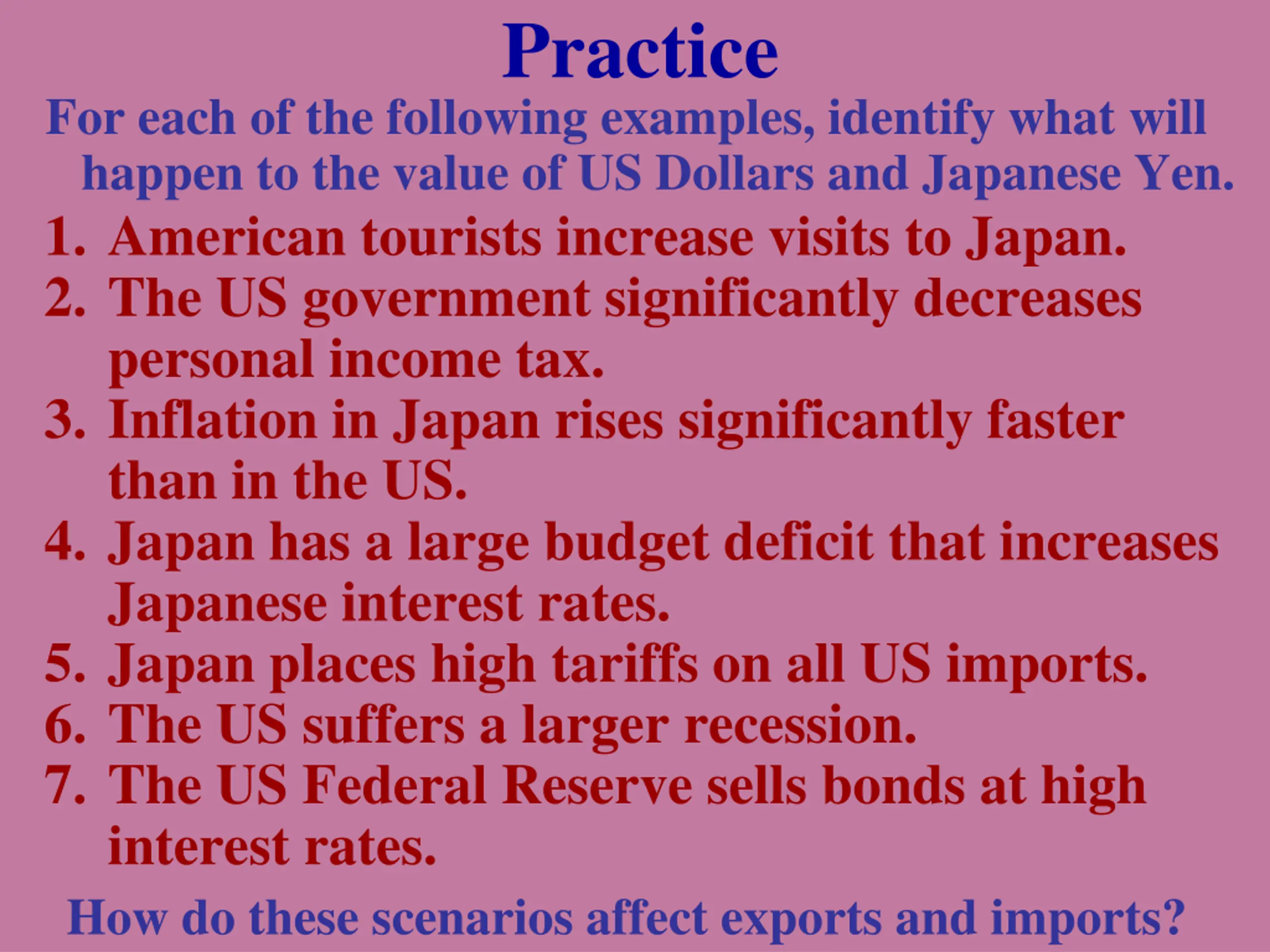 Practice For each of the following examples, identify what will happen to the value of US Dollars and Japanese Yen. 1. American tourists increase visits to Japan. 2. The US government significantly decreases personal income tax. 3. Inflation in Japan rises significantly faster than in the US. 4. Japan has a large budget deficit that increases Japanese interest rates. 5. Japan places high tariffs on all US imports. 6. The US suffers a larger recession. 7. The US Federal Reserve sells bonds at high interest rates. How do these scenarios affect exports and imports?