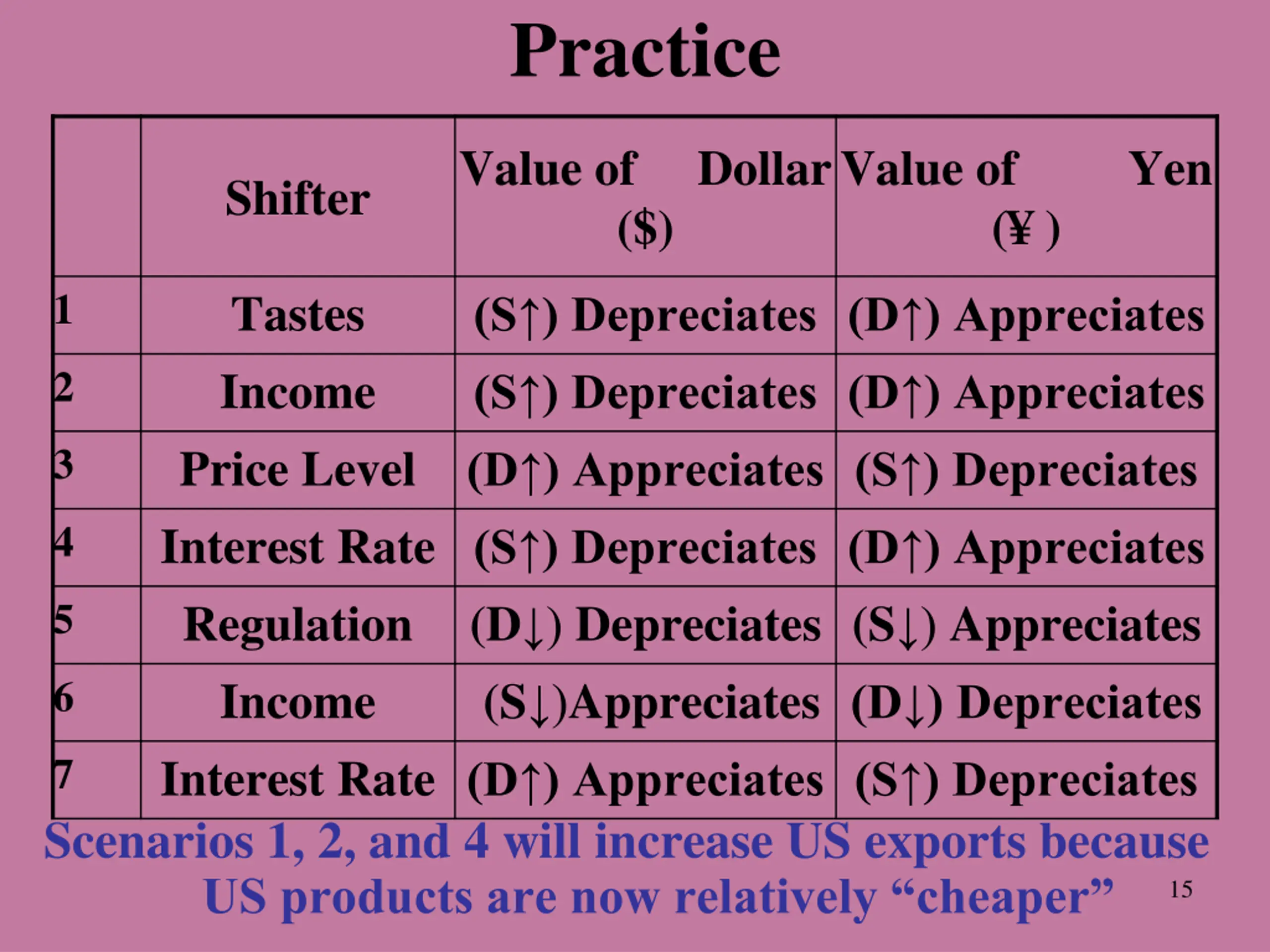 Practice Value of Dollar ($) Value of Yen ( ) Shifter 1 Tastes Income Price Level Interest Rate (S ) Depreciates (D ) Appreciates Regulation (D ) Depreciates (S ) Appreciates Income (S )Appreciates (D ) Depreciates Interest Rate (D ) Appreciates (S ) Depreciates Scenarios 1, 2, and 4 will increase US exports because US products are now relatively cheaper (S ) Depreciates (D ) Appreciates (S ) Depreciates (D ) Appreciates (D ) Appreciates (S ) Depreciates 2 3 4 5 6 7 15