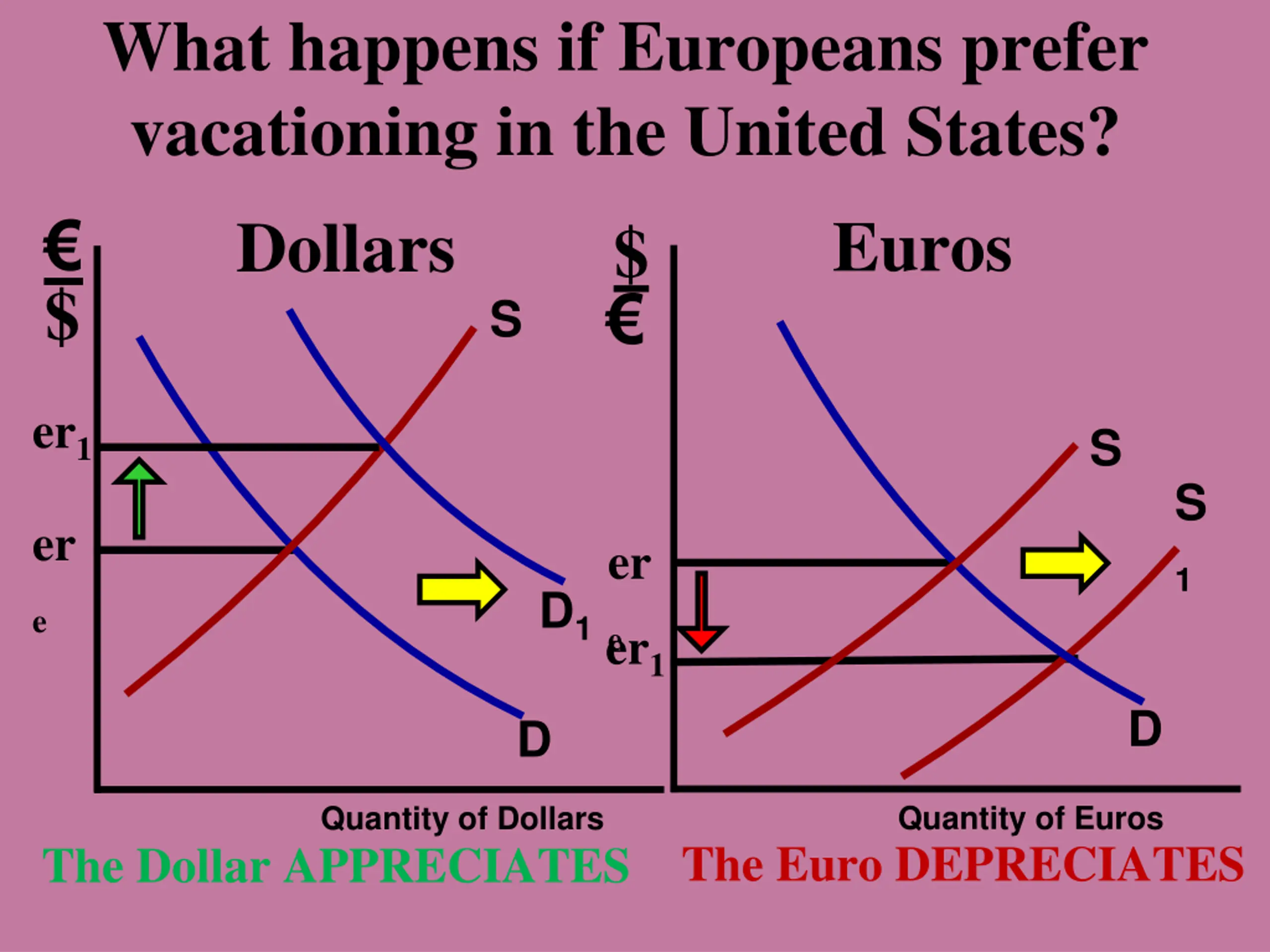 What happens if Europeans prefer vacationing in the United States? Euros Dollars $ $ S er1 S S er er 1 D1 e er1 e D D Quantity of Euros Quantity of Dollars The Dollar APPRECIATES The Euro DEPRECIATES