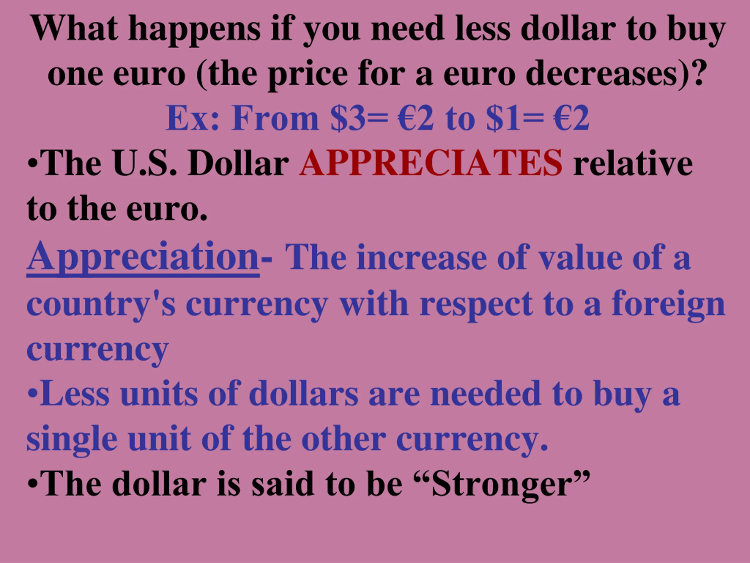 What happens if you need less dollar to buy one euro (the price for a euro decreases)? Ex: From $3= 2 to $1= 2 The U.S. Dollar APPRECIATES relative to the euro. Appreciation- The increase of value of a country's currency with respect to a foreign currency Less units of dollars are needed to buy a single unit of the other currency. The dollar is said to be Stronger