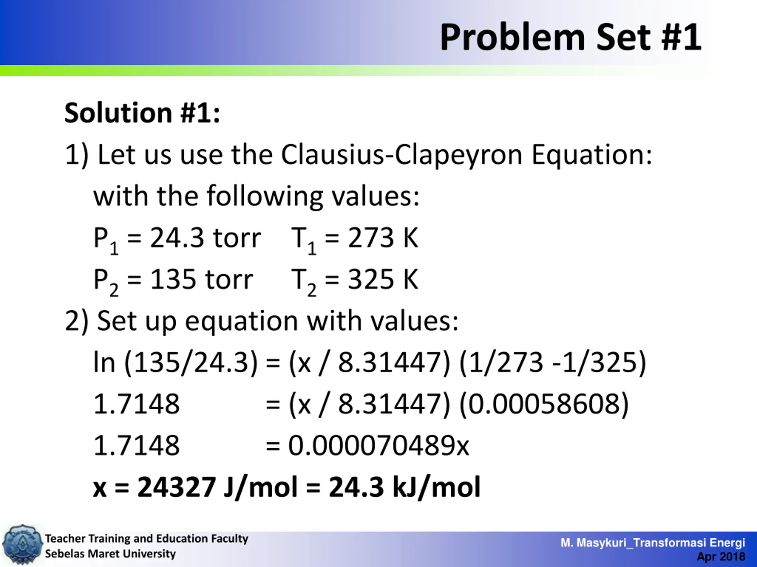 Problem Set #1 Problem #1: Determine Hvap for a compound that has a measured vapor pressure of 24.3 torr at 273 K and 135 torr at 325 K. Teacher Training and Education Faculty Sebelas Maret University M. Masykuri_Transformasi Energi Apr 2018