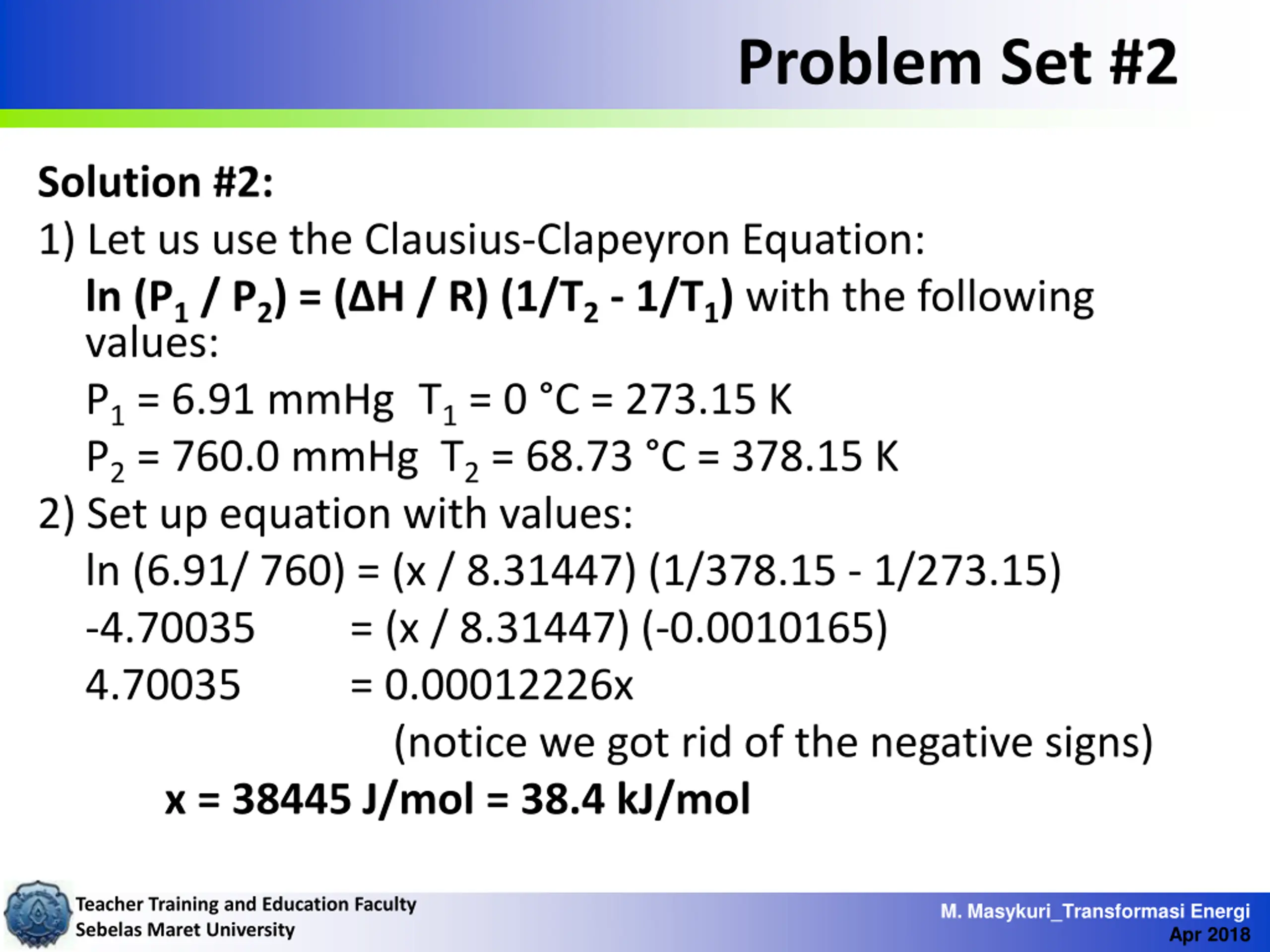 Problem Set #2 Solution #2: 1) Let us use the Clausius-Clapeyron Equation: ln (P1 / P2) = ( H / R) (1/T2 - 1/T1) with the following values: P1 = 6.91 mmHg T1 = 0 C = 273.15 K P2 = 760.0 mmHg T2 = 68.73 C = 378.15 K 2) Set up equation with values: ln (6.91/ 760) = (x / 8.31447) (1/378.15 - 1/273.15) -4.70035 = (x / 8.31447) (-0.0010165) 4.70035 = 0.00012226x (notice we got rid of the negative signs) x = 38445 J/mol = 38.4 kJ/mol Teacher Training and Education Faculty Sebelas Maret University M. Masykuri_Transformasi Energi Apr 2018