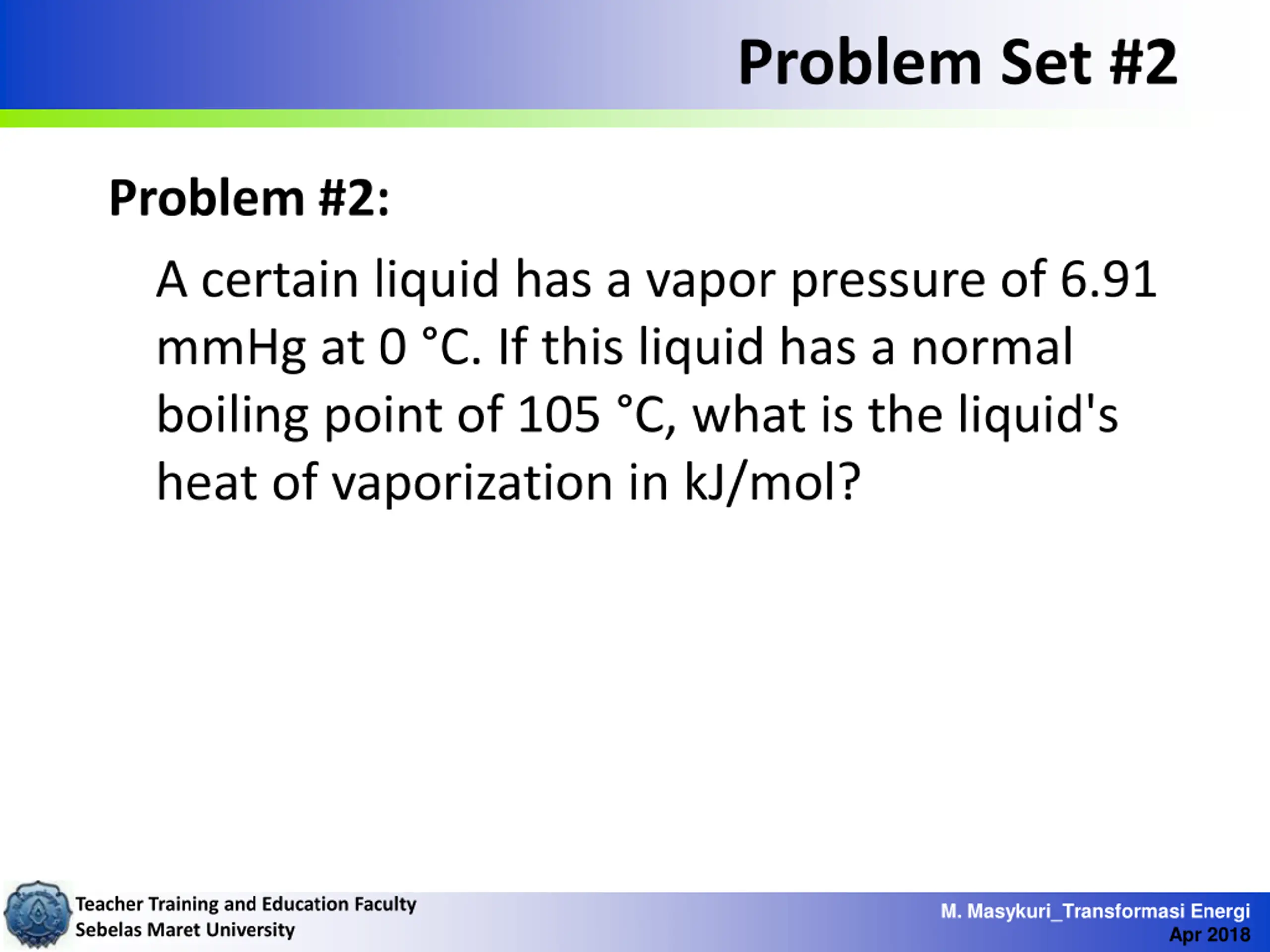 Problem Set #2 Problem #2: A certain liquid has a vapor pressure of 6.91 mmHg at 0 C. If this liquid has a normal boiling point of 105 C, what is the liquid's heat of vaporization in kJ/mol? Teacher Training and Education Faculty Sebelas Maret University M. Masykuri_Transformasi Energi Apr 2018