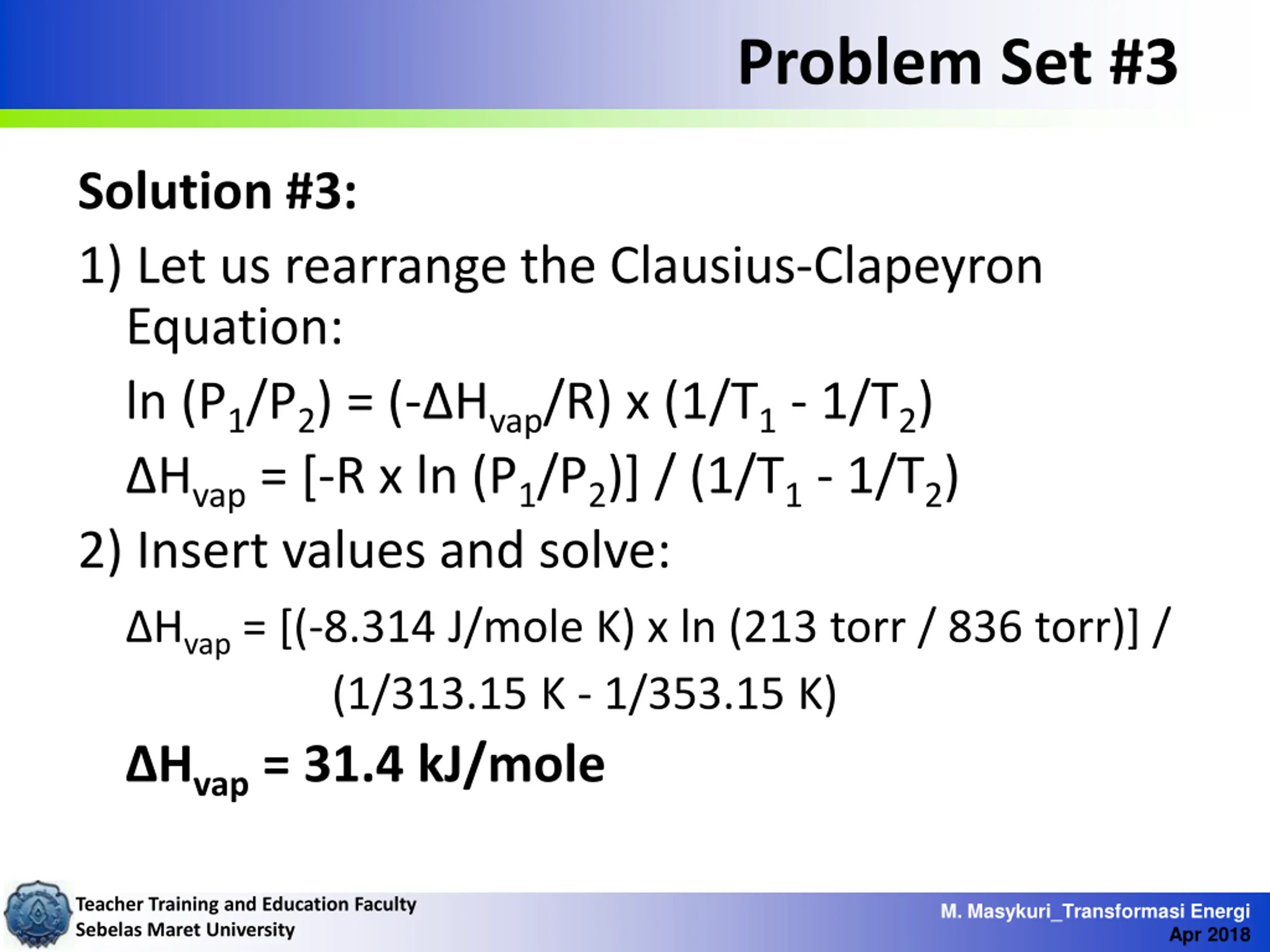 Problem Set #3 Solution #3: 1) Let us rearrange the Clausius-Clapeyron Equation: ln (P1/P2) = (- Hvap/R) x (1/T1 - 1/T2) Hvap = [-R x ln (P1/P2)] / (1/T1 - 1/T2) 2) Insert values and solve: Hvap = [(-8.314 J/mole K) x ln (213 torr / 836 torr)] / (1/313.15 K - 1/353.15 K) Hvap = 31.4 kJ/mole Teacher Training and Education Faculty Sebelas Maret University M. Masykuri_Transformasi Energi Apr 2018