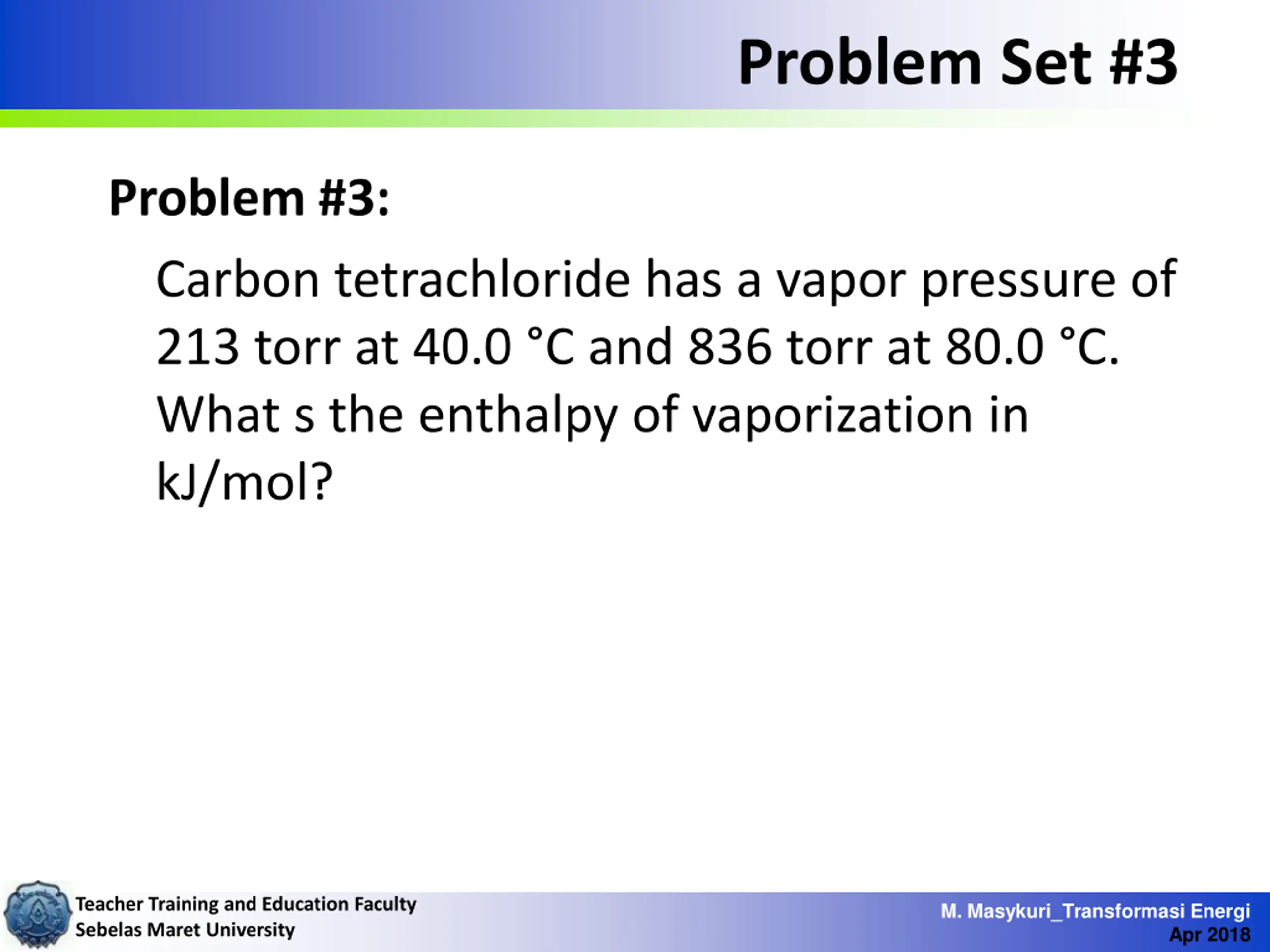 Problem Set #3 Problem #3: Carbon tetrachloride has a vapor pressure of 213 torr at 40.0 C and 836 torr at 80.0 C. What s the enthalpy of vaporization in kJ/mol? Teacher Training and Education Faculty Sebelas Maret University M. Masykuri_Transformasi Energi Apr 2018