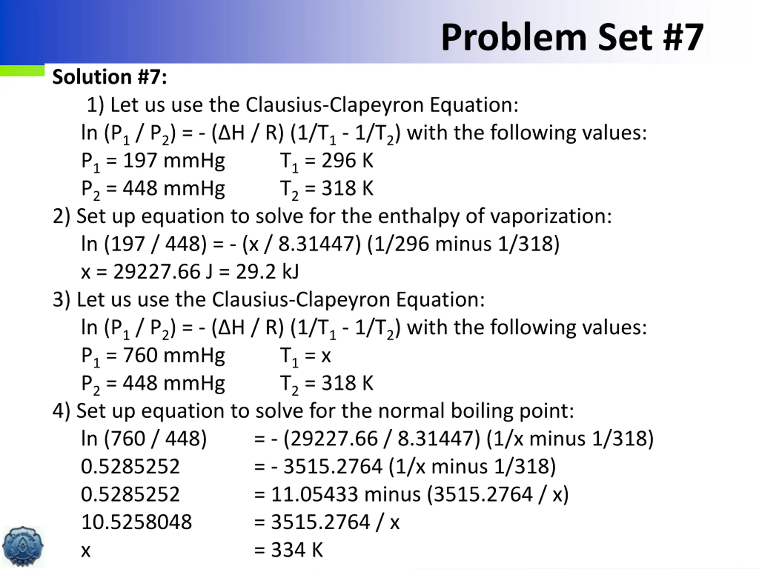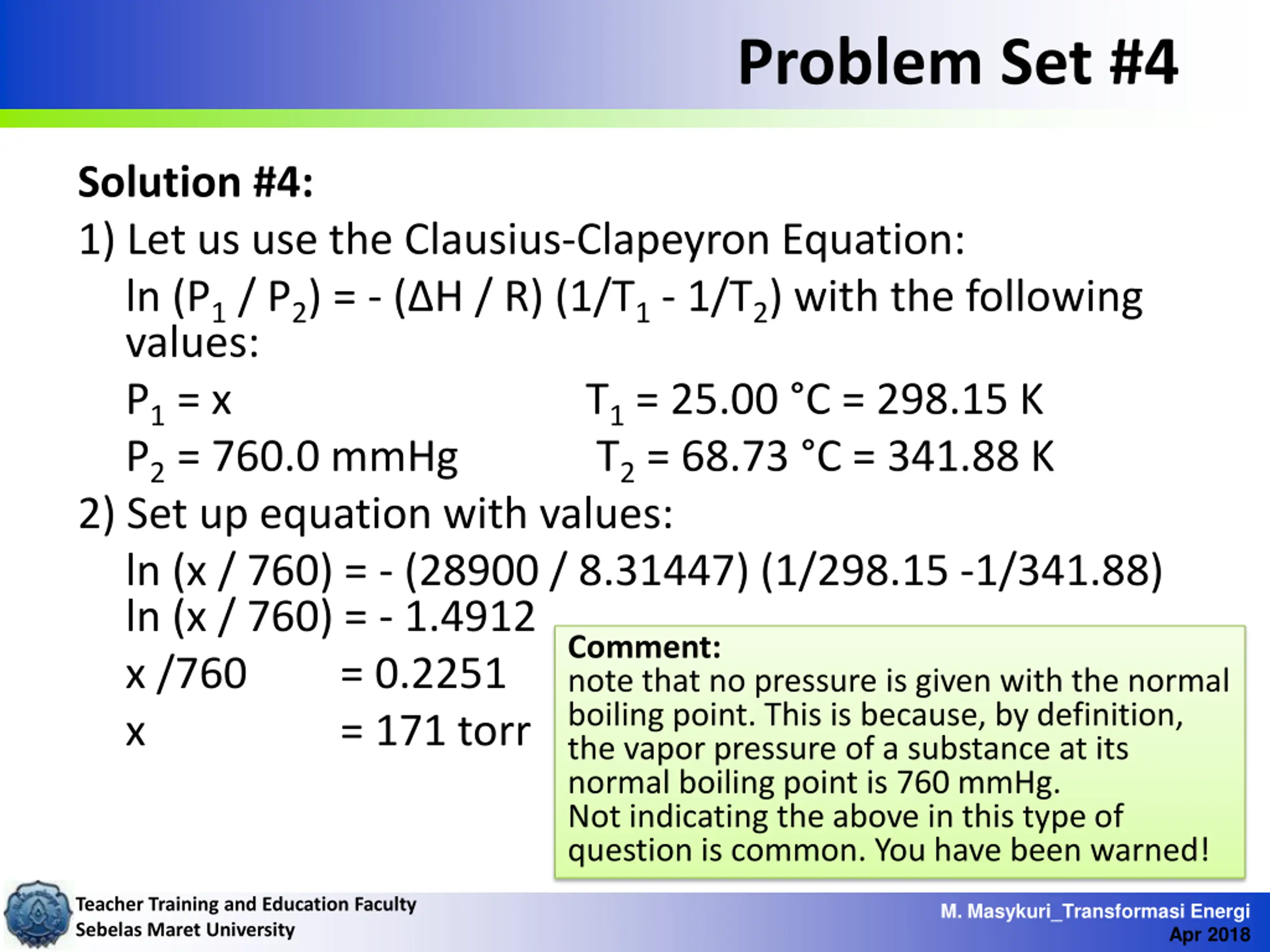 Problem Set #4 Solution #4: 1) Let us use the Clausius-Clapeyron Equation: ln (P1 / P2) = - ( H / R) (1/T1 - 1/T2) with the following values: P1 = x T1 = 25.00 C = 298.15 K P2 = 760.0 mmHg T2 = 68.73 C = 341.88 K 2) Set up equation with values: ln (x / 760) = - (28900 / 8.31447) (1/298.15 -1/341.88) ln (x / 760) = - 1.4912 x /760 = 0.2251 x = 171 torr the vapor pressure of a substance at its normal boiling point is 760 mmHg. Not indicating the above in this type of question is common. You have been warned! Comment: note that no pressure is given with the normal boiling point. This is because, by definition, Teacher Training and Education Faculty Sebelas Maret University M. Masykuri_Transformasi Energi Apr 2018