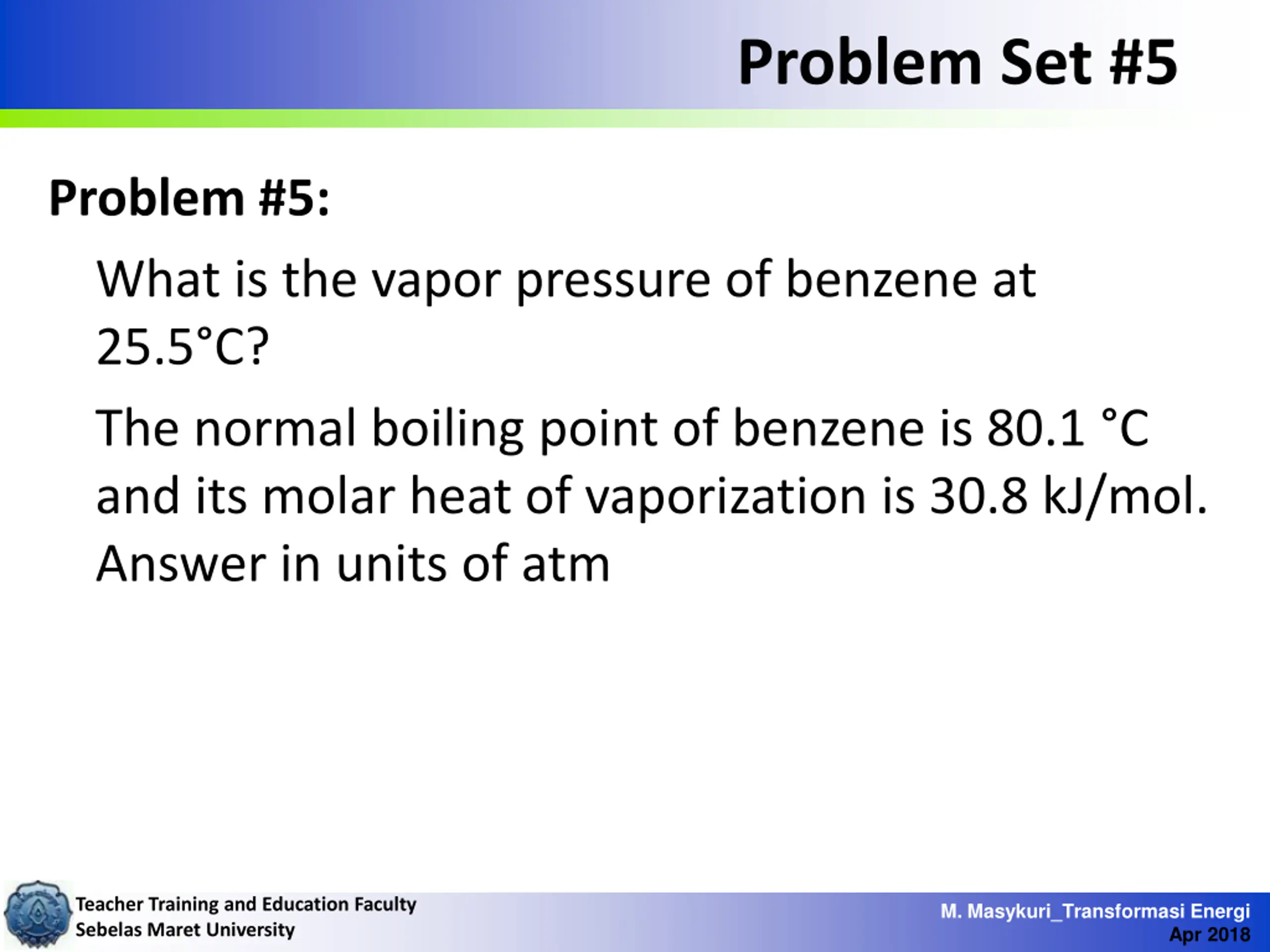 Problem Set #5 Problem #5: What is the vapor pressure of benzene at 25.5 C? The normal boiling point of benzene is 80.1 C and its molar heat of vaporization is 30.8 kJ/mol. Answer in units of atm Teacher Training and Education Faculty Sebelas Maret University M. Masykuri_Transformasi Energi Apr 2018