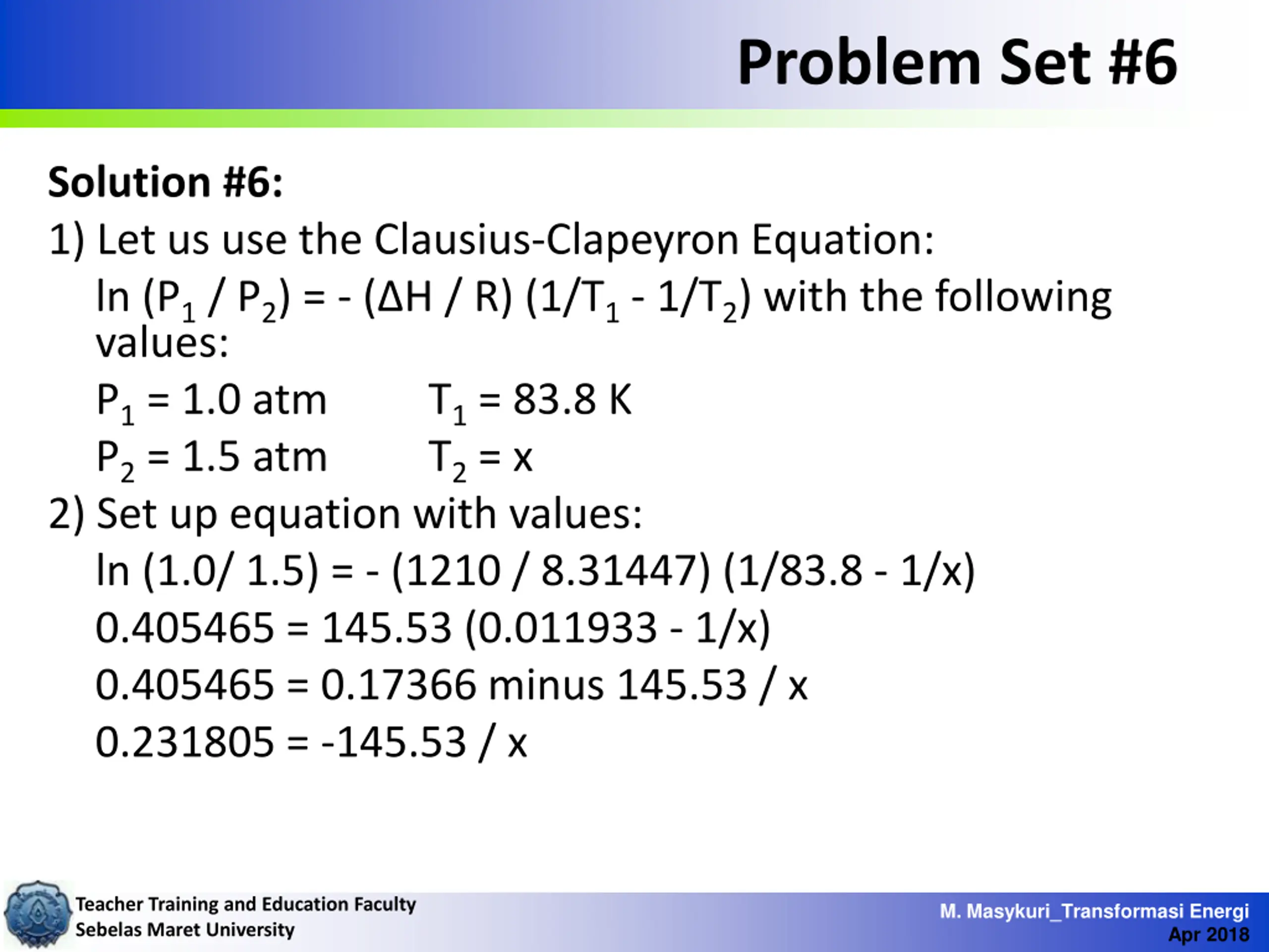 Problem Set #6 Solution #6: 1) Let us use the Clausius-Clapeyron Equation: ln (P1 / P2) = - ( H / R) (1/T1 - 1/T2) with the following values: P1 = 1.0 atm T1 = 83.8 K P2 = 1.5 atm T2 = x 2) Set up equation with values: ln (1.0/ 1.5) = - (1210 / 8.31447) (1/83.8 - 1/x) 0.405465 = 145.53 (0.011933 - 1/x) 0.405465 = 0.17366 minus 145.53 / x 0.231805 = -145.53 / x Teacher Training and Education Faculty Sebelas Maret University M. Masykuri_Transformasi Energi Apr 2018