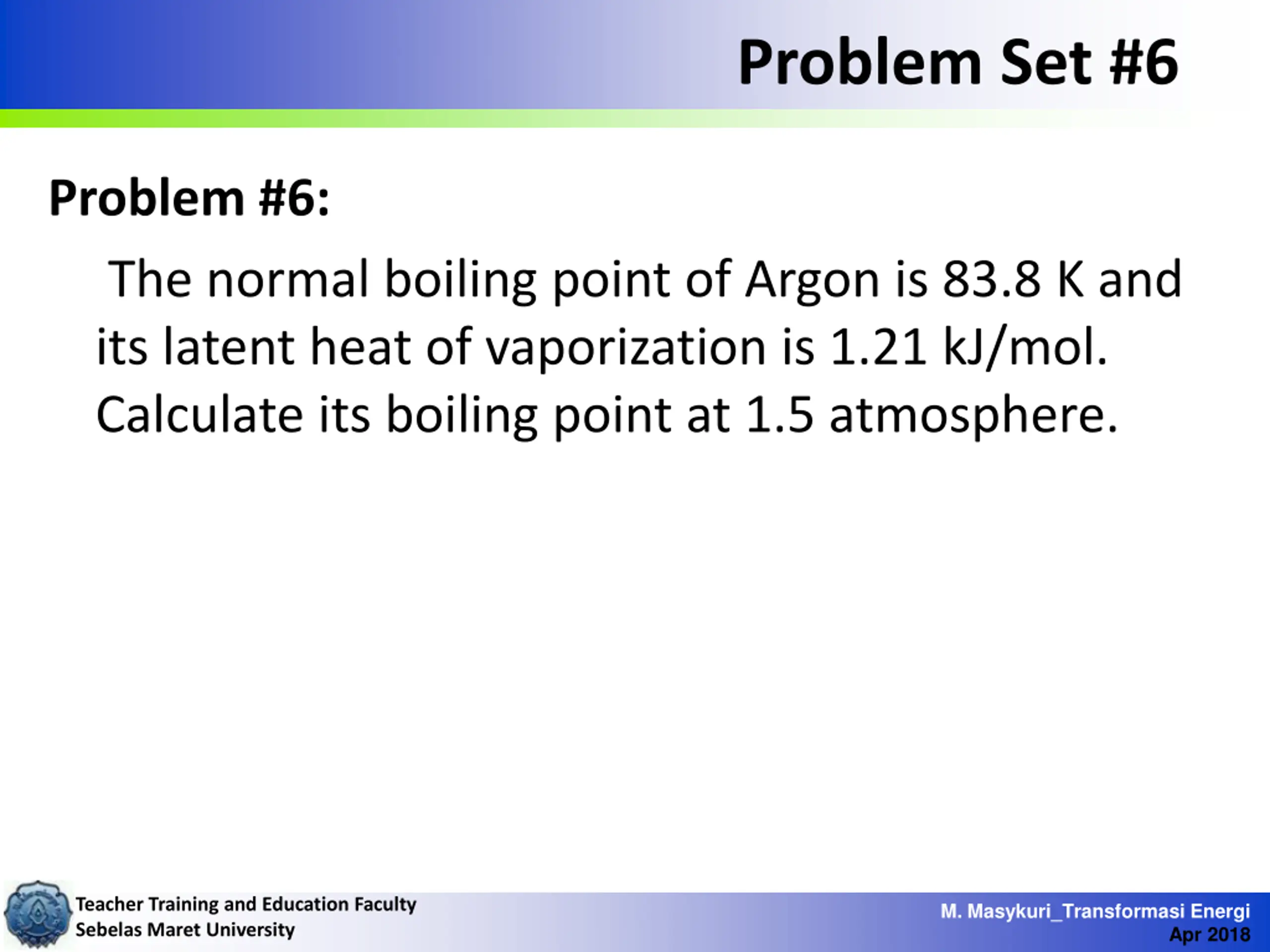Problem Set #6 Problem #6: The normal boiling point of Argon is 83.8 K and its latent heat of vaporization is 1.21 kJ/mol. Calculate its boiling point at 1.5 atmosphere. Teacher Training and Education Faculty Sebelas Maret University M. Masykuri_Transformasi Energi Apr 2018