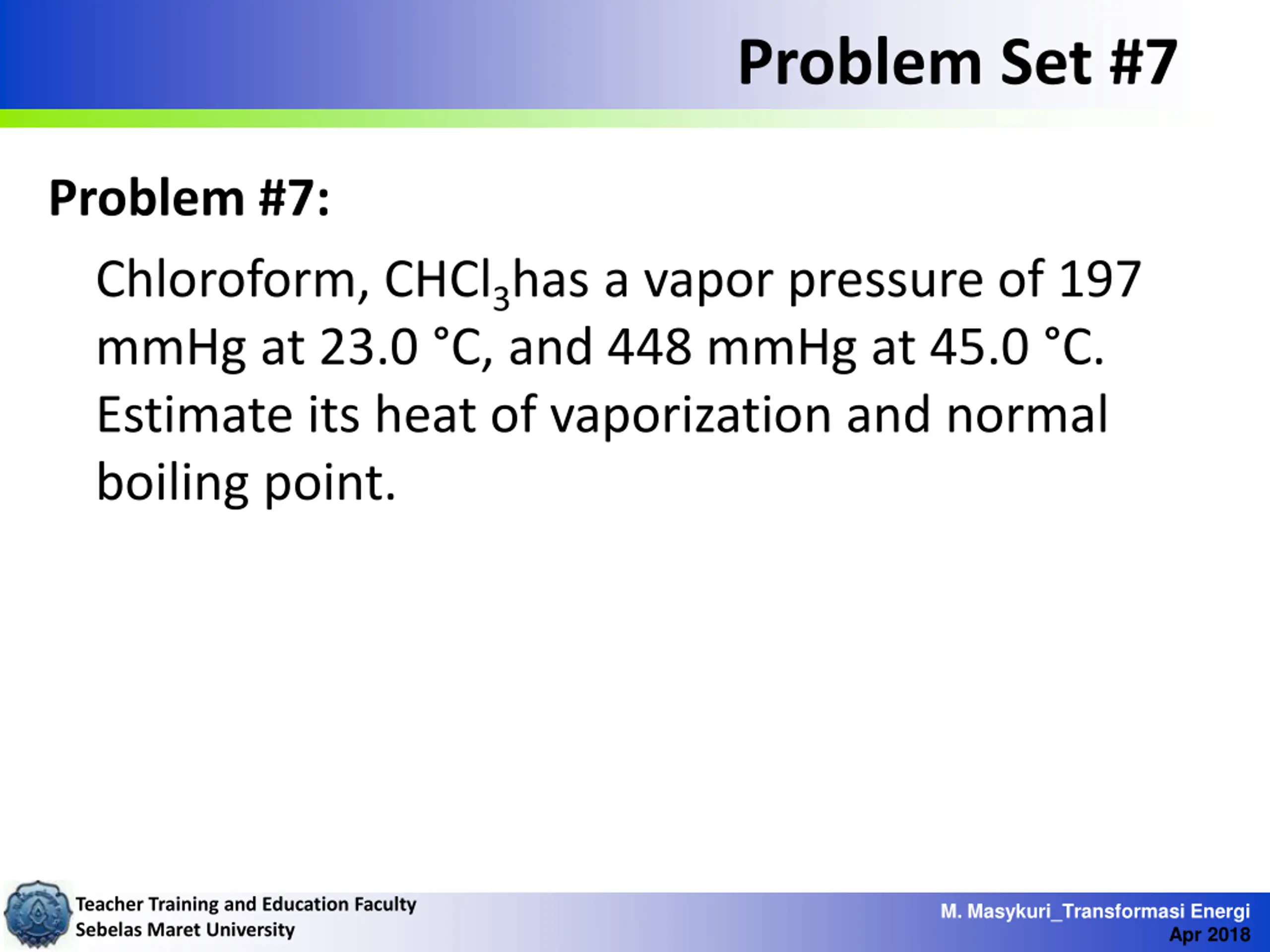 Problem Set #7 Problem #7: Chloroform, CHCl3has a vapor pressure of 197 mmHg at 23.0 C, and 448 mmHg at 45.0 C. Estimate its heat of vaporization and normal boiling point. Teacher Training and Education Faculty Sebelas Maret University M. Masykuri_Transformasi Energi Apr 2018