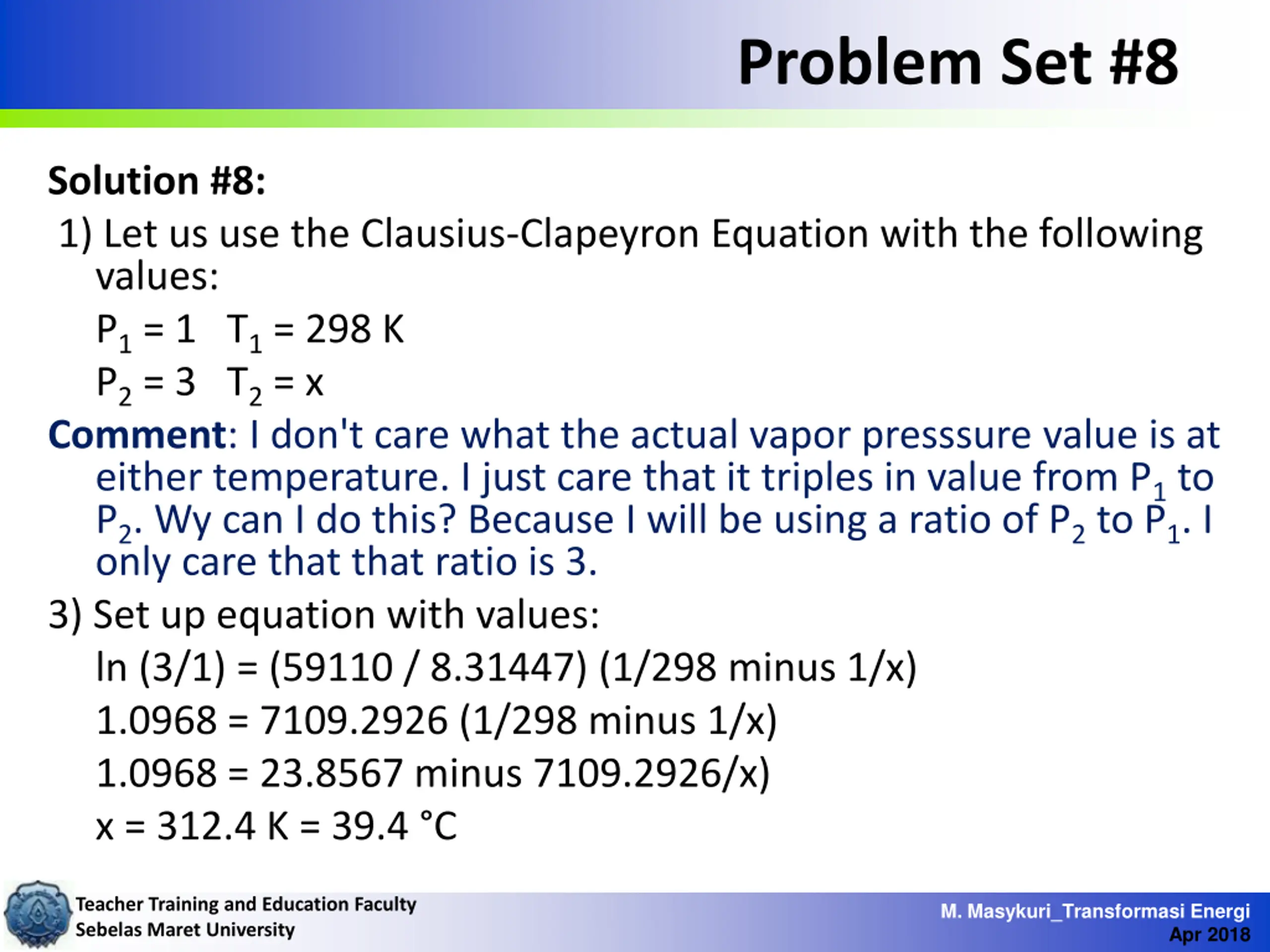 Problem Set #8 Solution #8: 1) Let us use the Clausius-Clapeyron Equation with the following values: P1 = 1 T1 = 298 K P2 = 3 T2 = x Comment: I don't care what the actual vapor presssure value is at either temperature. I just care that it triples in value from P1 to P2. Wy can I do this? Because I will be using a ratio of P2 to P1. I only care that that ratio is 3. 3) Set up equation with values: ln (3/1) = (59110 / 8.31447) (1/298 minus 1/x) 1.0968 = 7109.2926 (1/298 minus 1/x) 1.0968 = 23.8567 minus 7109.2926/x) x = 312.4 K = 39.4 C Teacher Training and Education Faculty Sebelas Maret University M. Masykuri_Transformasi Energi Apr 2018