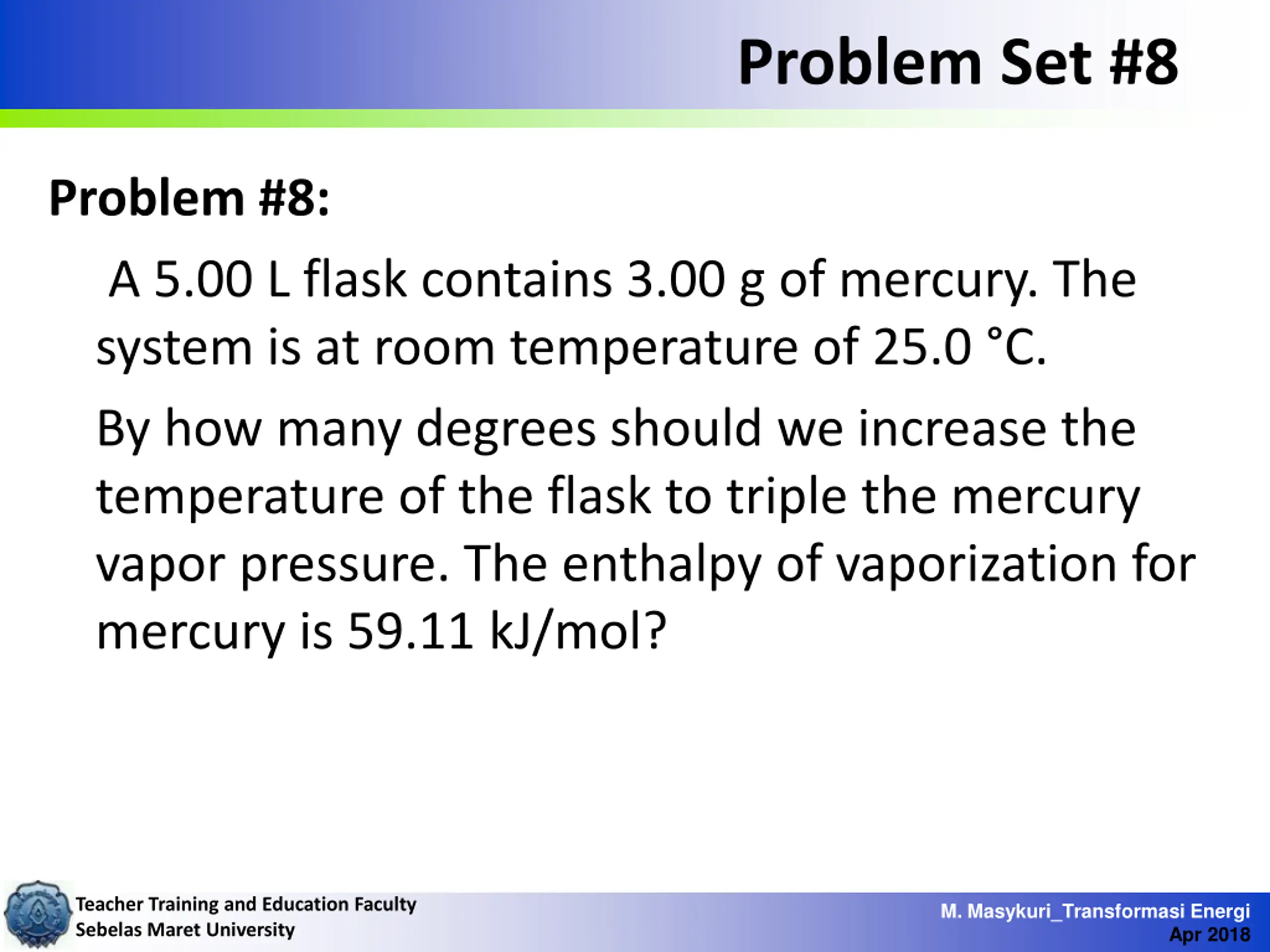 Problem Set #8 Problem #8: A 5.00 L flask contains 3.00 g of mercury. The system is at room temperature of 25.0 C. By how many degrees should we increase the temperature of the flask to triple the mercury vapor pressure. The enthalpy of vaporization for mercury is 59.11 kJ/mol? Teacher Training and Education Faculty Sebelas Maret University M. Masykuri_Transformasi Energi Apr 2018