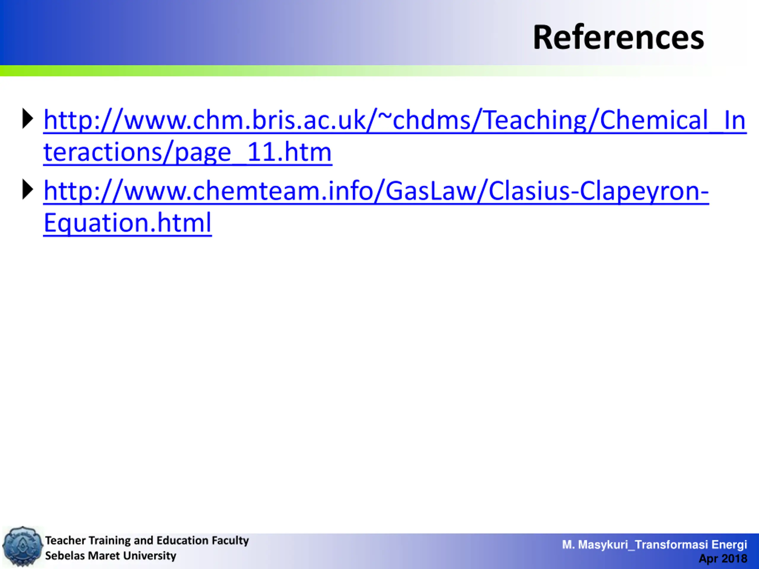 References http://www.chm.bris.ac.uk/~chdms/Teaching/Chemical_In teractions/page_11.htm http://www.chemteam.info/GasLaw/Clasius-Clapeyron- Equation.html Teacher Training and Education Faculty Sebelas Maret University M. Masykuri_Transformasi Energi Apr 2018