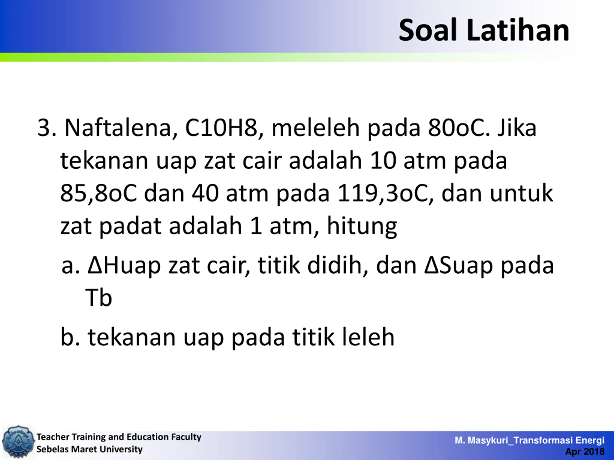 Soal Latihan 3. Naftalena, C10H8, meleleh pada 80oC. Jika tekanan uap zat cair adalah 10 atm pada 85,8oC dan 40 atm pada 119,3oC, dan untuk zat padat adalah 1 atm, hitung a. Huap zat cair, titik didih, dan Suap pada Tb b. tekanan uap pada titik leleh Teacher Training and Education Faculty Sebelas Maret University M. Masykuri_Transformasi Energi Apr 2018