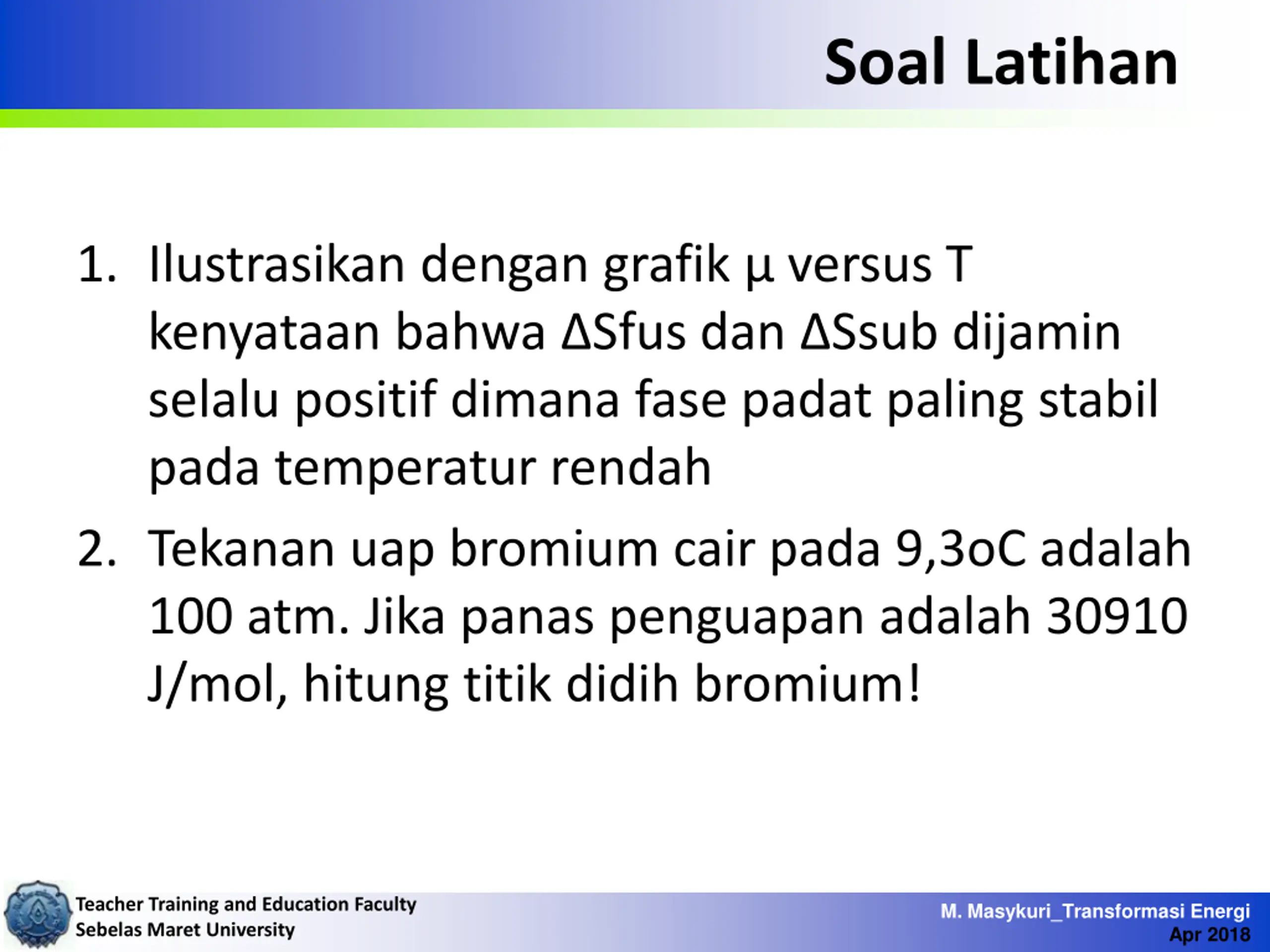 Soal Latihan 1. Ilustrasikan dengan grafik versus T kenyataan bahwa Sfus dan Ssub dijamin selalu positif dimana fase padat paling stabil pada temperatur rendah 2. Tekanan uap bromium cair pada 9,3oC adalah 100 atm. Jika panas penguapan adalah 30910 J/mol, hitung titik didih bromium! Teacher Training and Education Faculty Sebelas Maret University M. Masykuri_Transformasi Energi Apr 2018