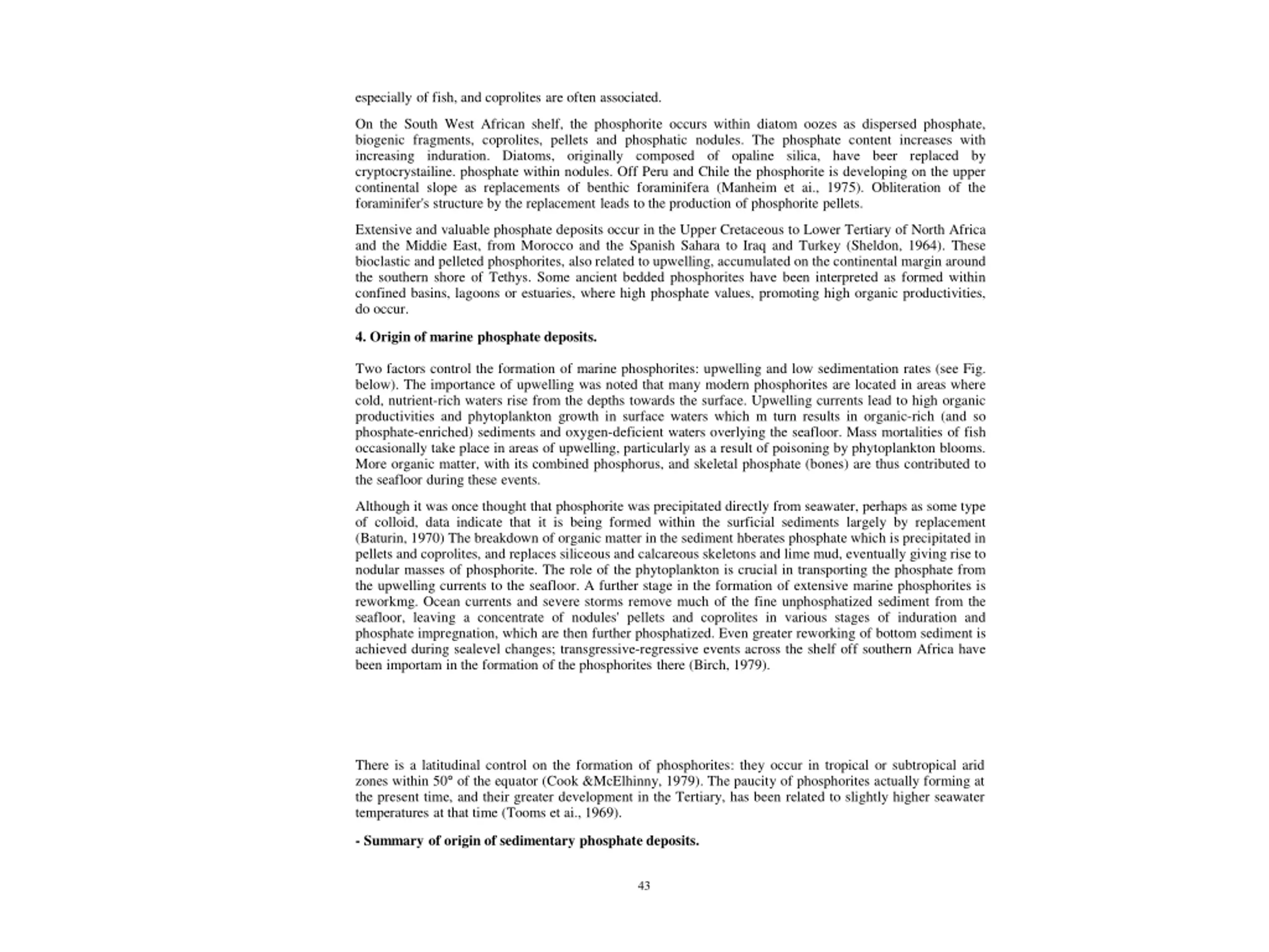 especially of fish, and coprolites are often associated. On the South West African shelf, the phosphorite occurs within diatom oozes as dispersed phosphate, biogenic fragments, coprolites, pellets and phosphatic nodules. The phosphate content increases with increasing induration. Diatoms, originally composed of opaline silica, have beer replaced by cryptocrystailine. phosphate within nodules. Off Peru and Chile the phosphorite is developing on the upper continental slope as replacements of benthic foraminifera (Manheim et ai., 1975). Obliteration of the foraminifer's structure by the replacement leads to the production of phosphorite pellets. Extensive and valuable phosphate deposits occur in the Upper Cretaceous to Lower Tertiary of North Africa and the Middie East, from Morocco and the Spanish Sahara to Iraq and Turkey (Sheldon, 1964). These bioclastic and pelleted phosphorites, also related to upwelling, accumulated on the continental margin around the southern shore of Tethys. Some ancient bedded phosphorites have been interpreted as formed within confined basins, lagoons or estuaries, where high phosphate values, promoting high organic productivities, do occur. 4. Origin of marine phosphate deposits. Two factors control the formation of marine phosphorites: upwelling and low sedimentation rates (see Fig. below). The importance of upwelling was noted that many modern phosphorites are located in areas where cold, nutrient-rich waters rise from the depths towards the surface. Upwelling currents lead to high organic productivities and phytoplankton growth in surface waters which m turn results in organic-rich (and so phosphate-enriched) sediments and oxygen-deficient waters overlying the seafloor. Mass mortalities of fish occasionally take place in areas of upwelling, particularly as a result of poisoning by phytoplankton blooms. More organic matter, with its combined phosphorus, and skeletal phosphate (bones) are thus contributed to the seafloor during these events. Although it was once thought that phosphorite was precipitated directly from seawater, perhaps as some type of colloid, data indicate that it is being formed within the surficial sediments largely by replacement (Baturin, 1970) The breakdown of organic matter in the sediment hberates phosphate which is precipitated in pellets and coprolites, and replaces siliceous and calcareous skeletons and lime mud, eventually giving rise to nodular masses of phosphorite. The role of the phytoplankton is crucial in transporting the phosphate from the upwelling currents to the seafloor. A further stage in the formation of extensive marine phosphorites is reworkmg. Ocean currents and severe storms remove much of the fine unphosphatized sediment from the seafloor, leaving a concentrate of nodules' pellets and coprolites in various stages of induration and phosphate impregnation, which are then further phosphatized. Even greater reworking of bottom sediment is achieved during sealevel changes; transgressive-regressive events across the shelf off southern Africa have been importam in the formation of the phosphorites there (Birch, 1979). There is a latitudinal control on the formation of phosphorites: they occur in tropical or subtropical arid zones within 50 of the equator (Cook &McElhinny, 1979). The paucity of phosphorites actually forming at the present time, and their greater development in the Tertiary, has been related to slightly higher seawater temperatures at that time (Tooms et ai., 1969). - Summary of origin of sedimentary phosphate deposits. 43