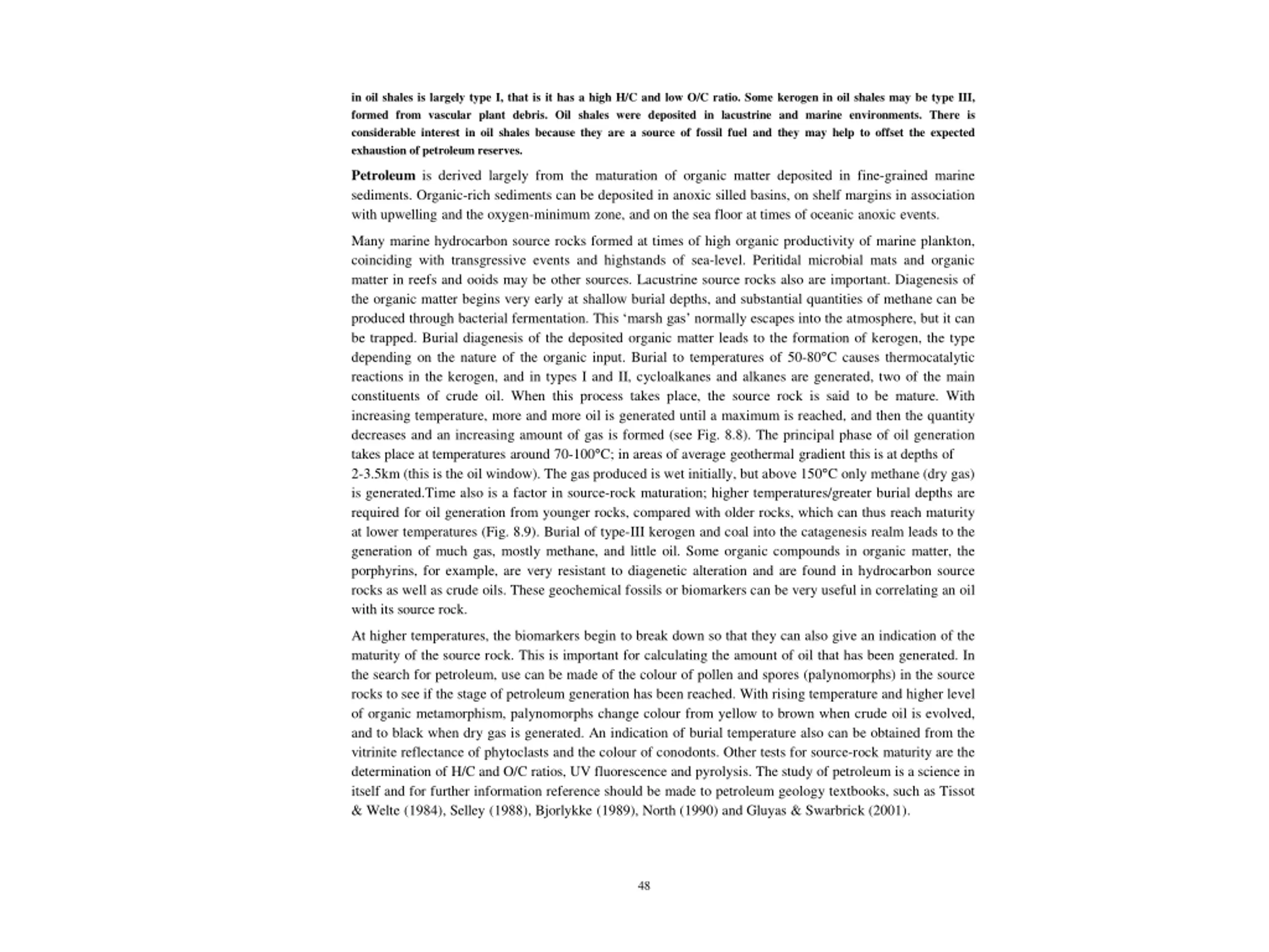 in oil shales is largely type I, that is it has a high H/C and low O/C ratio. Some kerogen in oil shales may be type III, formed from vascular plant debris. Oil shales were deposited in lacustrine and marine environments. There is considerable interest in oil shales because they are a source of fossil fuel and they may help to offset the expected exhaustion of petroleum reserves. Petroleum is derived largely from the maturation of organic matter deposited in fine-grained marine sediments. Organic-rich sediments can be deposited in anoxic silled basins, on shelf margins in association with upwelling and the oxygen-minimum zone, and on the sea floor at times of oceanic anoxic events. Many marine hydrocarbon source rocks formed at times of high organic productivity of marine plankton, coinciding with transgressive events and highstands of sea-level. Peritidal microbial mats and organic matter in reefs and ooids may be other sources. Lacustrine source rocks also are important. Diagenesis of the organic matter begins very early at shallow burial depths, and substantial quantities of methane can be produced through bacterial fermentation. This marshgas normally escapes into the atmosphere, but it can be trapped. Burial diagenesis of the deposited organic matter leads to the formation of kerogen, the type depending on the nature of the organic input. Burial to temperatures of 50-80 C causes thermocatalytic reactions in the kerogen, and in types I and II, cycloalkanes and alkanes are generated, two of the main constituents of crude oil. When this process takes place, the source rock is said to be mature. With increasing temperature, more and more oil is generated until a maximum is reached, and then the quantity decreases and an increasing amount of gas is formed (see Fig. 8.8). The principal phase of oil generation takes place at temperatures around 70-100 C; in areas of average geothermal gradient this is at depths of 2-3.5km (this is the oil window). The gas produced is wet initially, but above 150 C only methane (dry gas) is generated.Time also is a factor in source-rock maturation; higher temperatures/greater burial depths are required for oil generation from younger rocks, compared with older rocks, which can thus reach maturity at lower temperatures (Fig. 8.9). Burial of type-III kerogen and coal into the catagenesis realm leads to the generation of much gas, mostly methane, and little oil. Some organic compounds in organic matter, the porphyrins, for example, are very resistant to diagenetic alteration and are found in hydrocarbon source rocks as well as crude oils. These geochemical fossils or biomarkers can be very useful in correlating an oil with its source rock. At higher temperatures, the biomarkers begin to break down so that they can also give an indication of the maturity of the source rock. This is important for calculating the amount of oil that has been generated. In the search for petroleum, use can be made of the colour of pollen and spores (palynomorphs) in the source rocks to see if the stage of petroleum generation has been reached. With rising temperature and higher level of organic metamorphism, palynomorphs change colour from yellow to brown when crude oil is evolved, and to black when dry gas is generated. An indication of burial temperature also can be obtained from the vitrinite reflectance of phytoclasts and the colour of conodonts. Other tests for source-rock maturity are the determination of H/C and O/C ratios, UV fluorescence and pyrolysis. The study of petroleum is a science in itself and for further information reference should be made to petroleum geology textbooks, such as Tissot & Welte (1984), Selley (1988), Bjorlykke (1989), North (1990) and Gluyas & Swarbrick (2001). 48