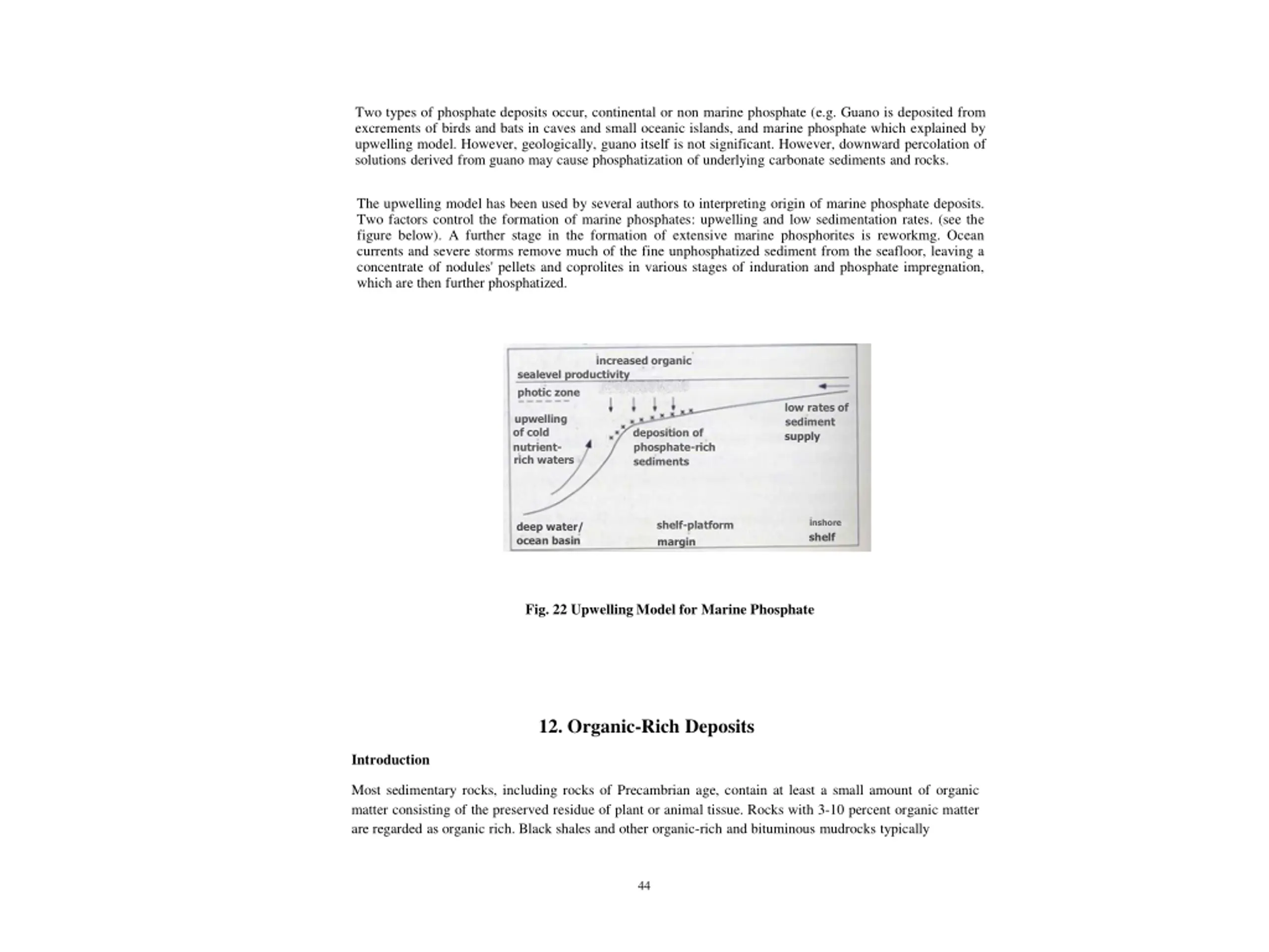 Two types of phosphate deposits occur, continental or non marine phosphate (e.g. Guano is deposited from excrements of birds and bats in caves and small oceanic islands, and marine phosphate which explained by upwelling model. However, geologically, guano itself is not significant. However, downward percolation of solutions derived from guano may cause phosphatization of underlying carbonate sediments and rocks. The upwelling model has been used by several authors to interpreting origin of marine phosphate deposits. Two factors control the formation of marine phosphates: upwelling and low sedimentation rates. (see the figure below). A further stage in the formation of extensive marine phosphorites is reworkmg. Ocean currents and severe storms remove much of the fine unphosphatized sediment from the seafloor, leaving a concentrate of nodules' pellets and coprolites in various stages of induration and phosphate impregnation, which are then further phosphatized. increased organic sealevel productivity photic zone low rates of sediment supply upwelling of cold nutrient- rich waters deposition of phosphate-rich sediments inshore shelf shelf-platform margin deep water/ ocean basin Fig. 22 Upwelling Model for Marine Phosphate 12. Organic-Rich Deposits Introduction Most sedimentary rocks, including rocks of Precambrian age, contain at least a small amount of organic matter consisting of the preserved residue of plant or animal tissue. Rocks with 3-10 percent organic matter are regarded as organic rich. Black shales and other organic-rich and bituminous mudrocks typically 44