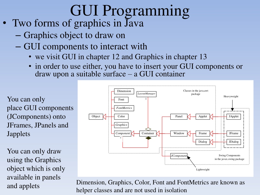 GUI Programming Two forms of graphics in Java Graphics object to draw on GUI components to interact with we visit GUI in chapter 12 and Graphics in chapter 13 in order to use either, you have to insert your GUI components or draw upon a suitable surface a GUI container Classes in the java.awt package Dimension LayoutManager Heavyweight You can only place GUI components (JComponents) onto JFrames, JPanels and Japplets 1 Font FontMetrics Object Color Panel Applet JApplet Graphics Container Window Frame JFrame Component * Dialog JDialog You can only draw using the Graphics object which is only available in panels and applets Swing Components in the javax.swing package JComponent Lightweight Dimension, Graphics, Color, Font and FontMetrics are known as helper classes and are not used in isolation