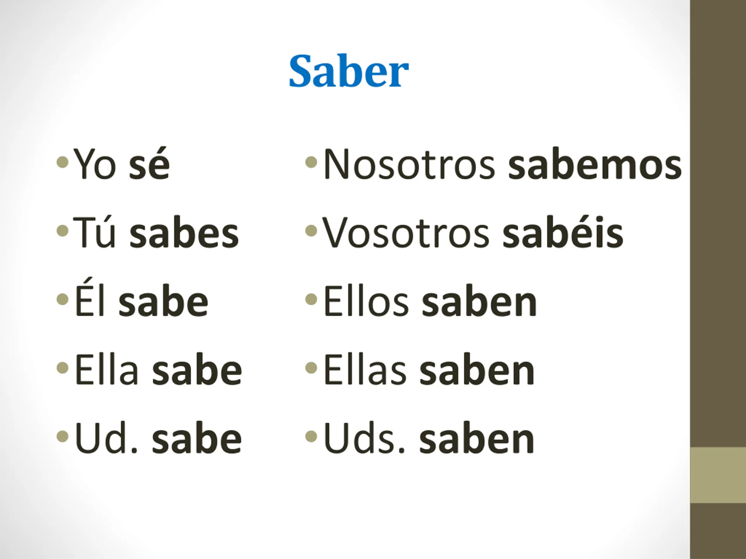 Saber Yo s T sabes l sabe Ella sabe Ud. sabe Nosotros sabemos Vosotros sab is Ellos saben Ellas saben Uds. saben
