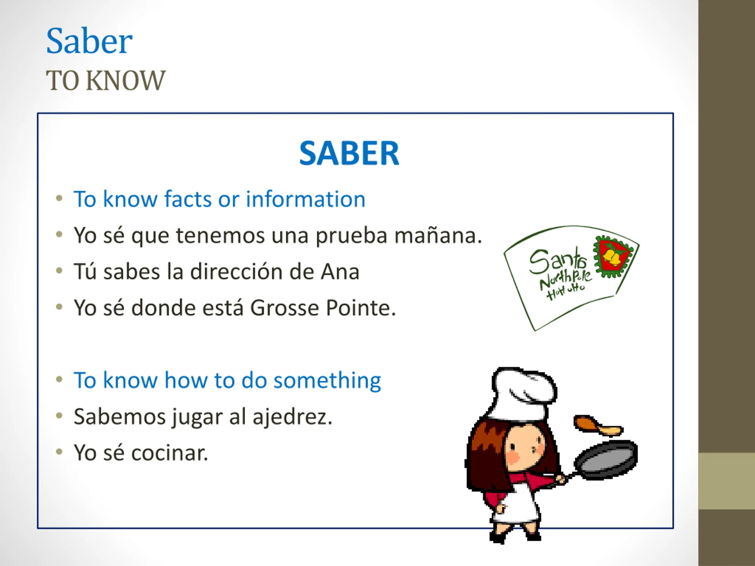 Saber TO KNOW SABER To know facts or information Yo s que tenemos una prueba ma ana. T sabes la direcci n de Ana Yo s donde est Grosse Pointe. To know how to do something Sabemos jugar al ajedrez. Yo s cocinar.