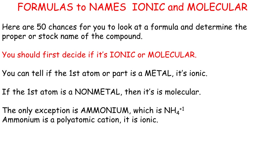 FORMULAS to NAMES IONIC and MOLECULAR Here are 50 chances for you to look at a formula and determine the proper or stock name of the compound. You should first decide if it s IONIC or MOLECULAR. You can tell if the 1st atom or part is a METAL, it s ionic. If the 1st atom is a NONMETAL, then it s is molecular. The only exception is AMMONIUM, which is NH4+1 Ammonium is a polyatomic cation, it is ionic.