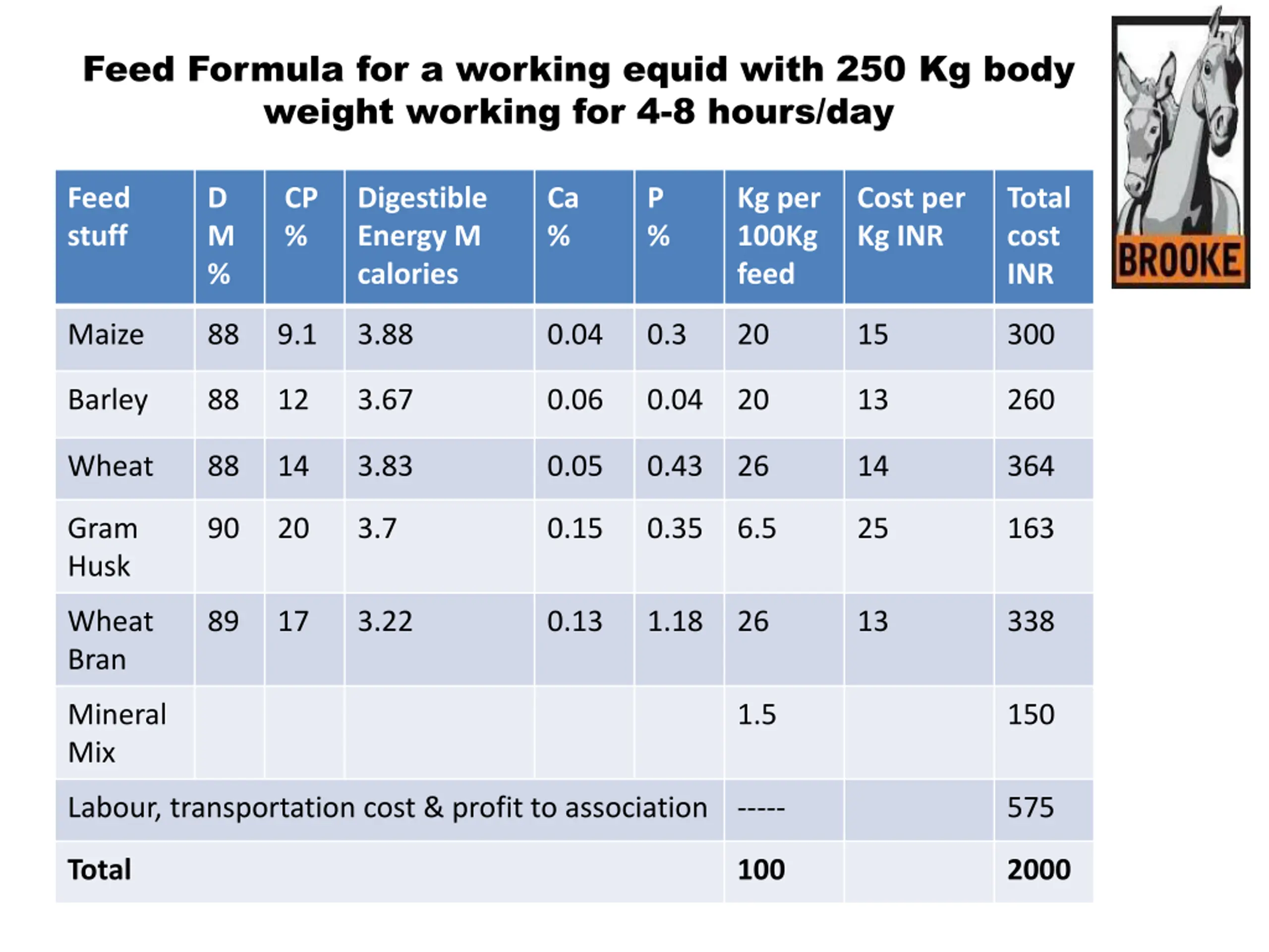 Feed Formula for a working equid with 250 Kg body weight working for 4-8 hours/day Feed stuff D M % CP % Digestible Energy M calories Ca % P % Kg per 100Kg feed Cost per Kg INR Total cost INR Maize 88 9.1 3.88 0.04 0.3 20 15 300 Barley 88 12 3.67 0.06 0.04 20 13 260 Wheat 88 14 3.83 0.05 0.43 26 14 364 Gram Husk 90 20 3.7 0.15 0.35 6.5 25 163 Wheat Bran 89 17 3.22 0.13 1.18 26 13 338 Mineral Mix 1.5 150 Labour, transportation cost & profit to association ----- 575 Total 100 2000 @theBrooke