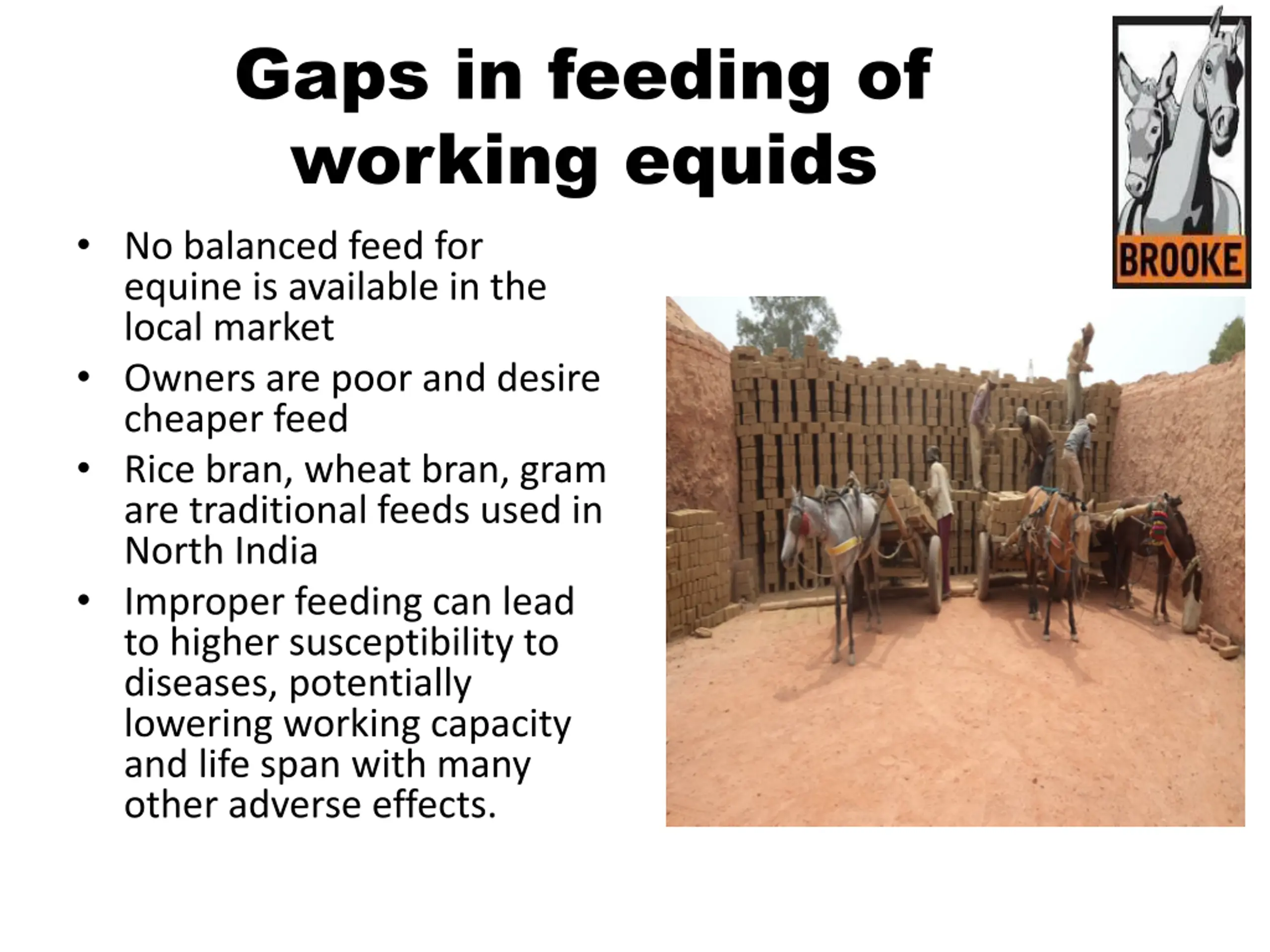 Gaps in feeding of working equids No balanced feed for equine is available in the local market Owners are poor and desire cheaper feed Rice bran, wheat bran, gram are traditional feeds used in North India Improper feeding can lead to higher susceptibility to diseases, potentially lowering working capacity and life span with many other adverse effects. @theBrooke